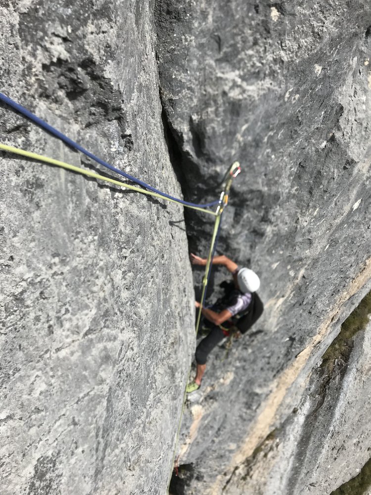 4 SL: 50m bis 7+ und eine 2m stelle Ao (über 7c??), die lezten 20 leichtes Gelände in bestem Fels