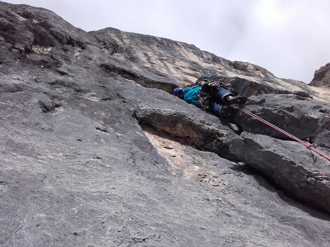 An.: Die Route wurde von Unbekannten schon zuvor, vermutlich vor 2000 bis 2 Meter über dem Stand von Seillänge 2 begangen (alte Kronenbohrhaken).