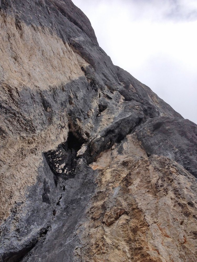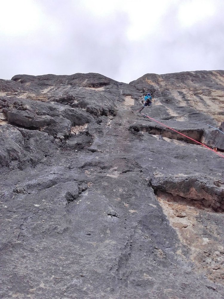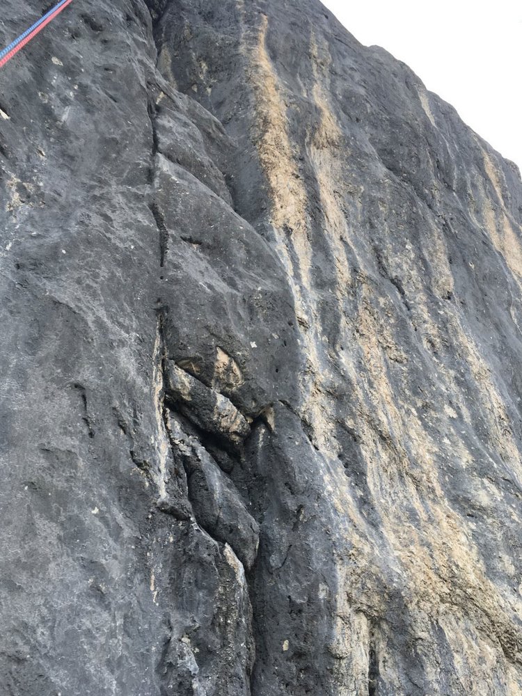 Spektakuläre Linie links der Dächerzone. Gut abzusichernde Risse. Stände an Inox Bohrhaken. Zwischensicherungen müssen großteils selbst abgebracht werden. Die schwierigsten Stellen können technisch an mobilen Sicherungsmitteln geklettert werden. Die anspruchsvollste der drei Routen. Umgang mit mobilen Sicherungsmitteln und solides Klettern bis zum 8ten Grad wird empfohlen.