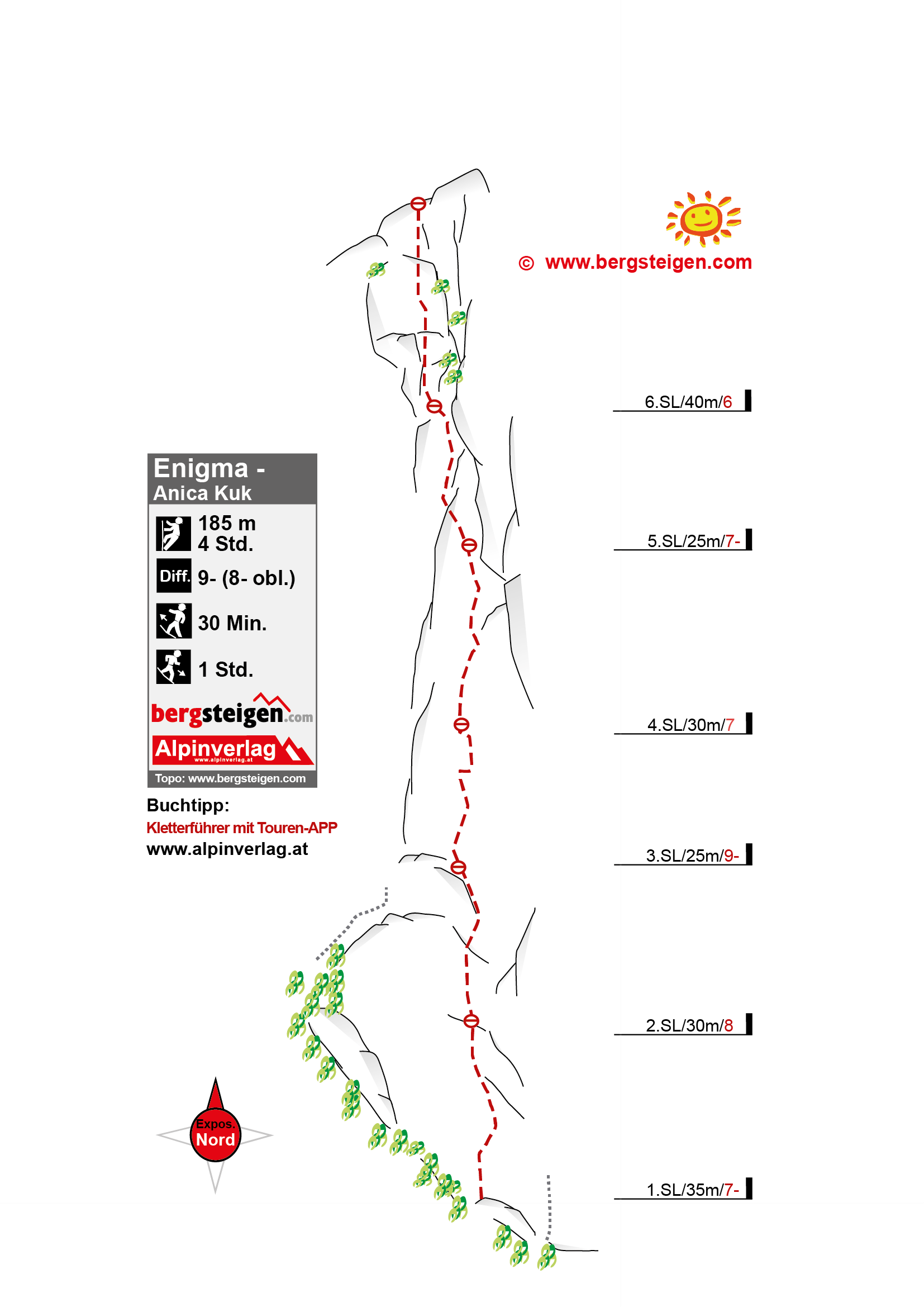 Ein wahres Schmankerl zieht da durch die Nordwand des Anica Kuk im Wandteil: „Sjeverna stijena“. Zu Unrecht ein wenig abseits der beliebten Touren, bietet dieses Highlight alles, was ein Kletterherz benötigt- Platten, Leisten, überhängende Piazrisse, und noch viel mehr.