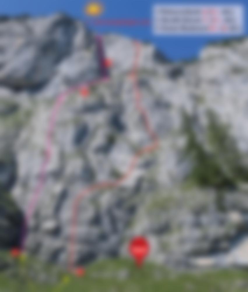 Wer will, kann noch die beiden Seillängen der Route "Polsterschlacht - Koralle Extrem“ links daneben anhängen (siehe Topo).