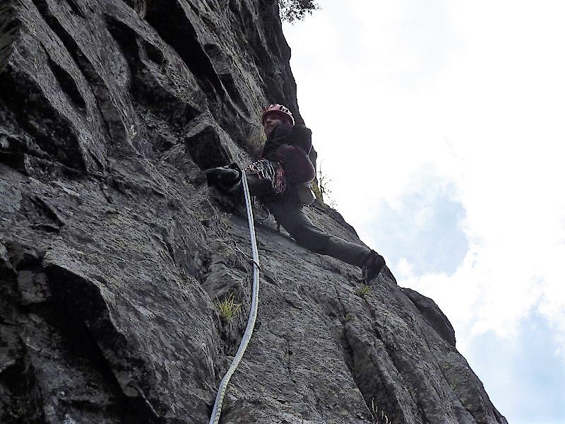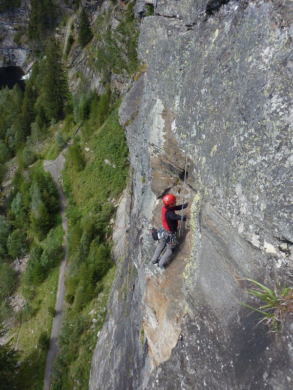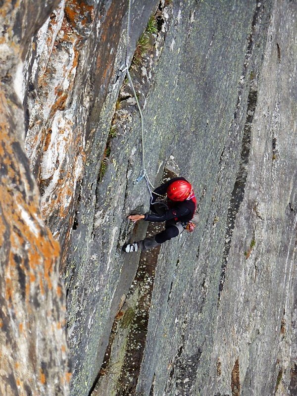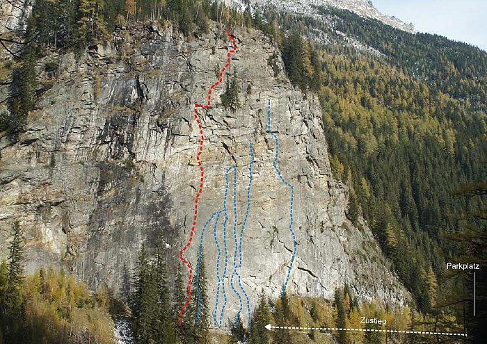 Diese Tour hier ist momentan die einzige Route, die die gesamte Wand durchsteigt. Und sie ist – wie alle Routen dieser Wand – gut!! Oben ein bisschen flechtig, aber das stört kaum. Die Schlüsselseillänge ist völlig Lange-Wand-untypisch recht steil. Hat man die ersten 10m hinter sich gebracht (und den zweiten Bolt der ersten Länge geklickt), ist sie auch gut abgesichert. Wem zuviel Luft zwischen Boden und zweitem Bolt ist, der kann auch zwei Routen weiter links über ein gut gesicherte Sportklettertour zum ersten Stand hinaufklettern (6a). Die Tour trocknet nicht so schnell ab wie die anderen Touren.