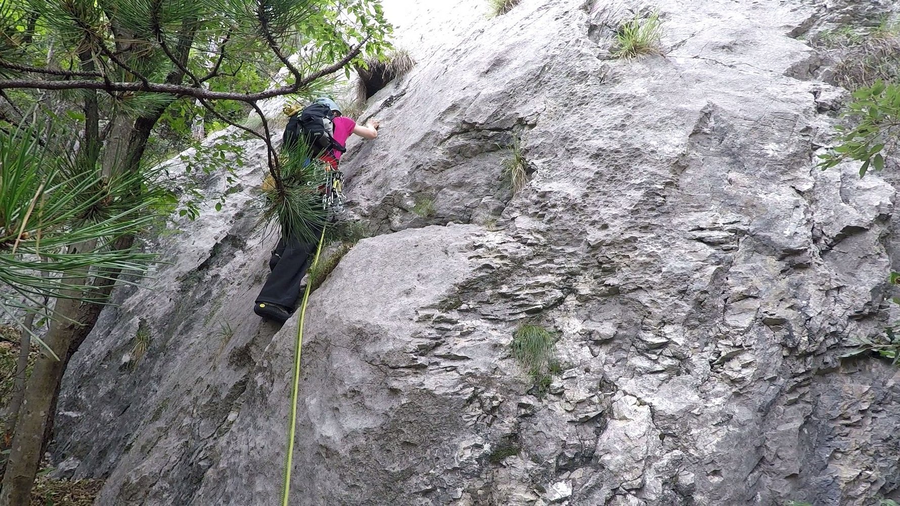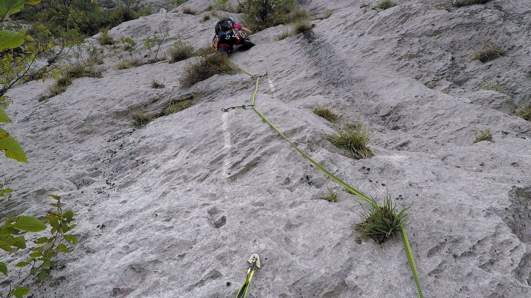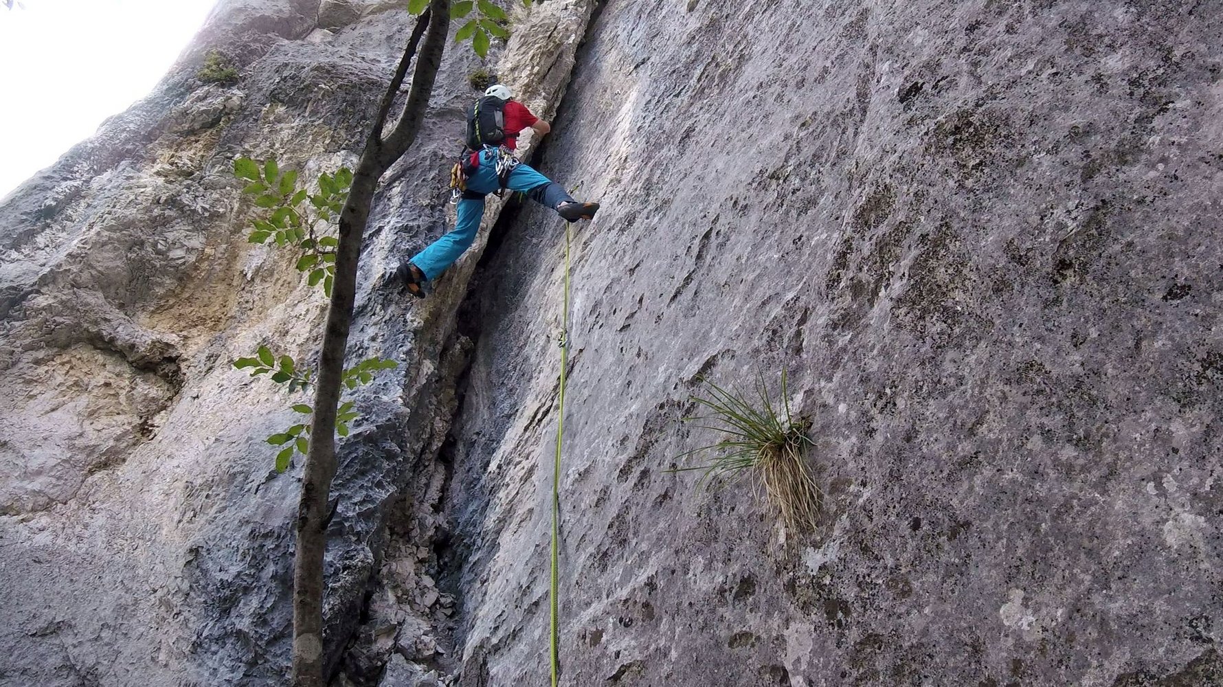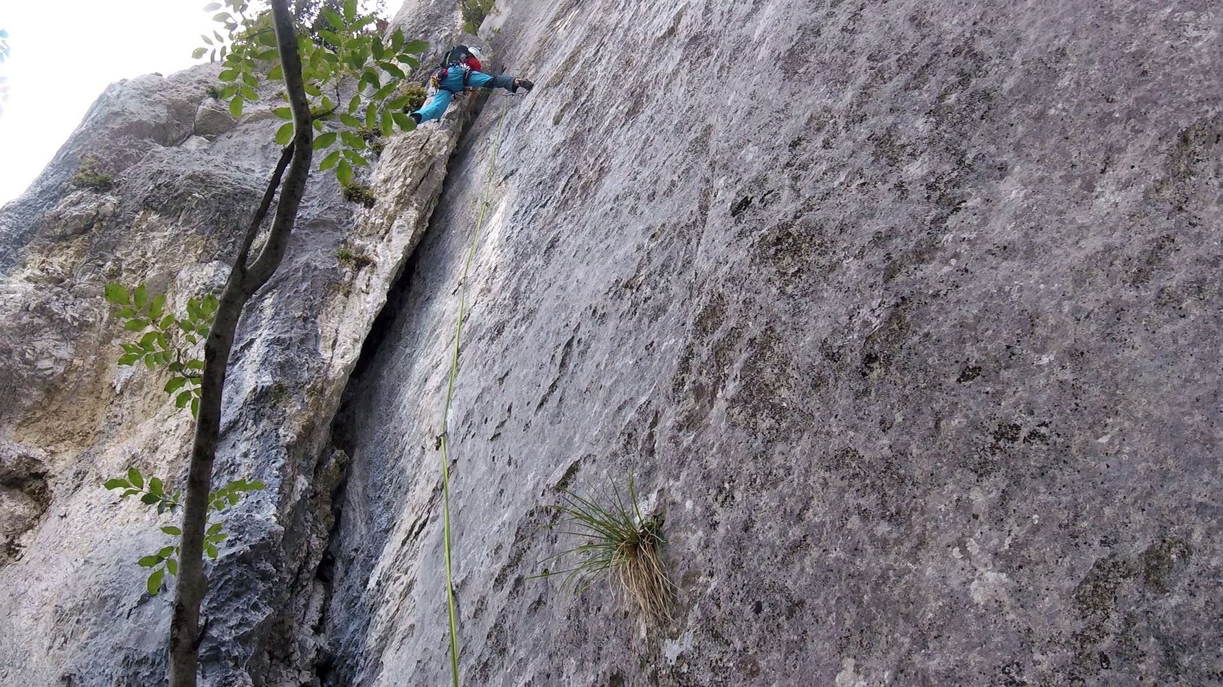 In der Seillänge vor der Schlüsselseillänge ist der Fels nicht ganz fest, es stecken aber wirklich viele Bohrhaken.
