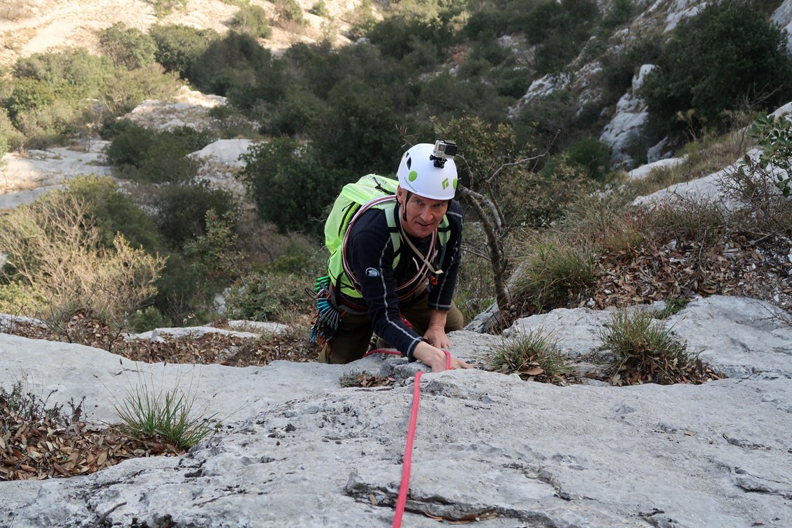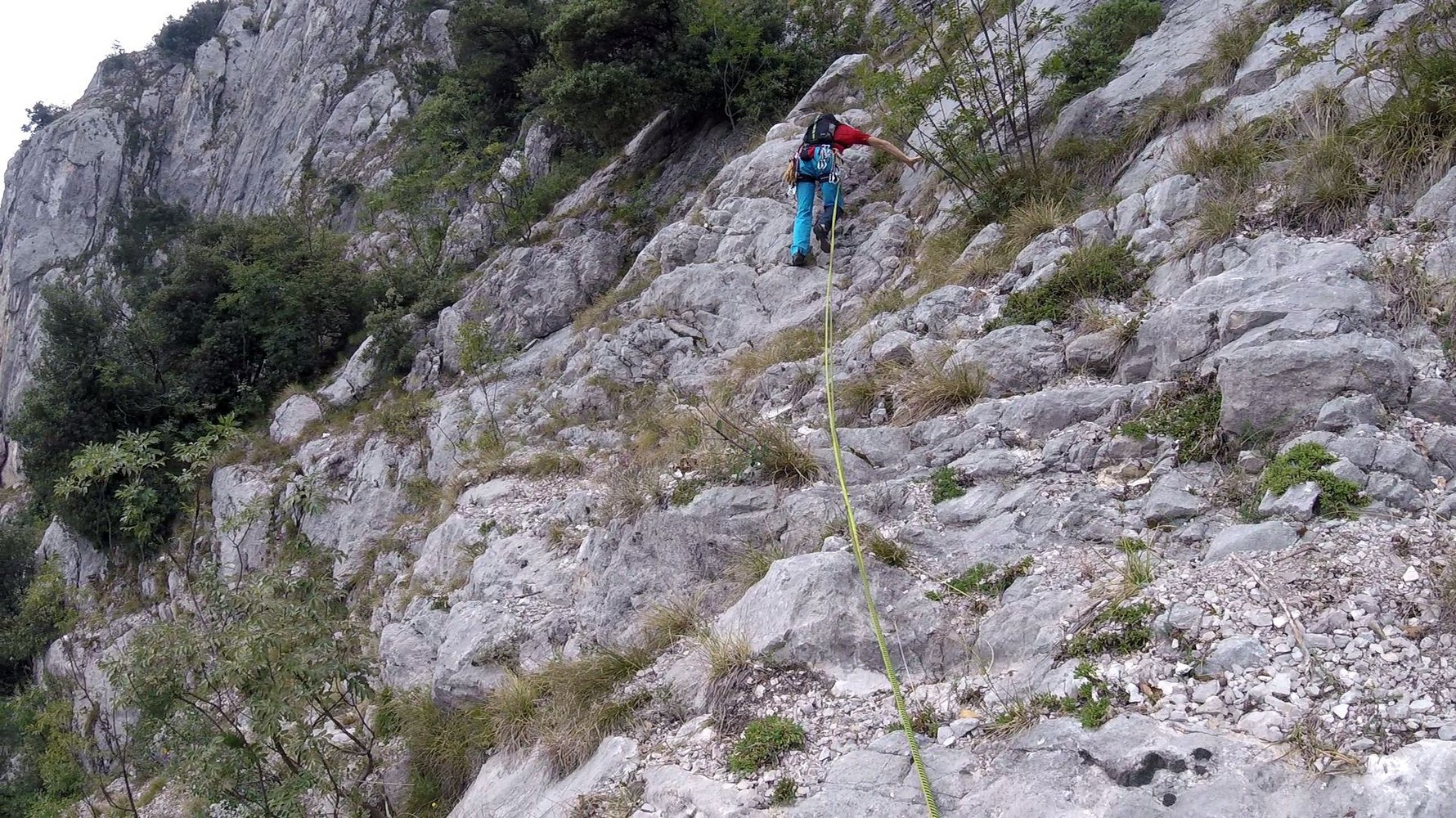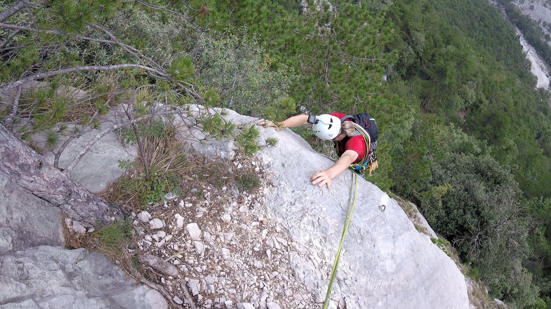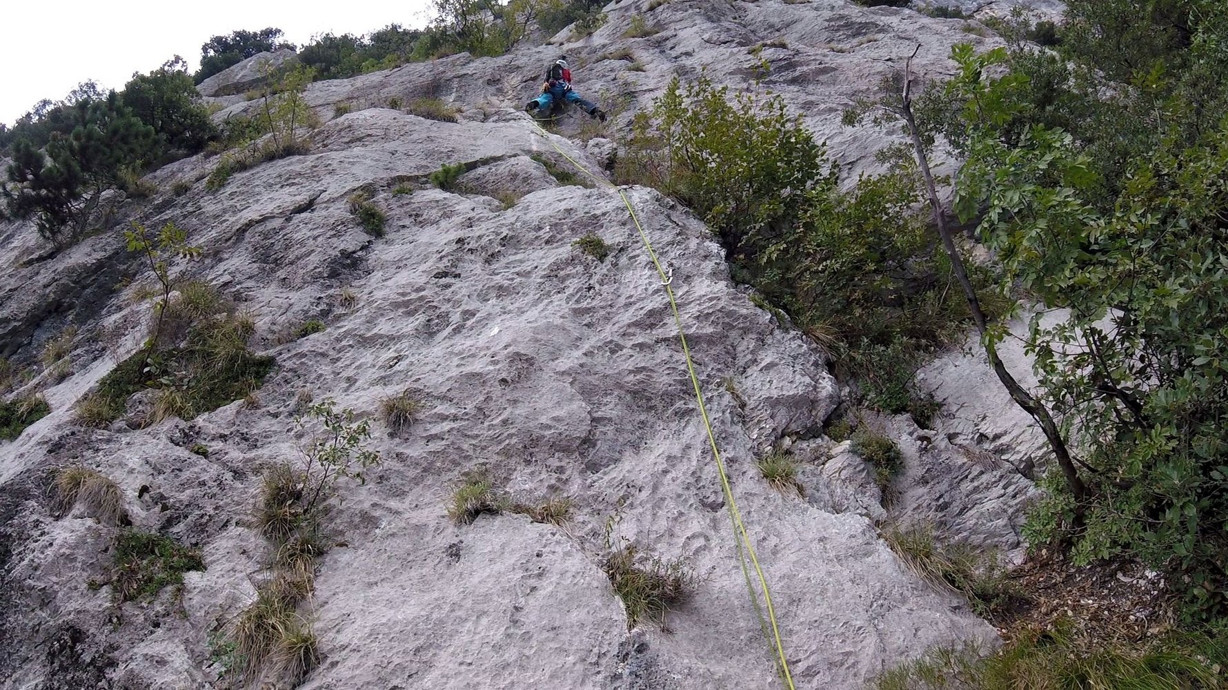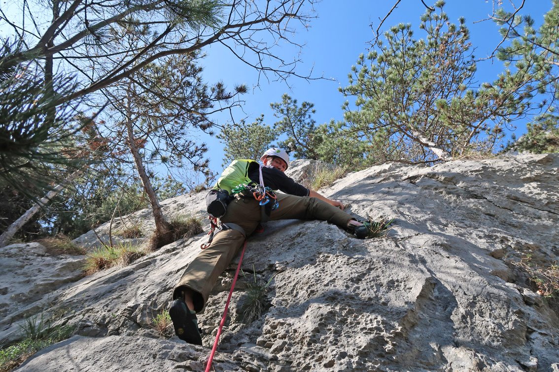 In der Seillänge vor der Schlüsselseillänge ist der Fels nicht ganz fest, es stecken aber wirklich viele Bohrhaken.