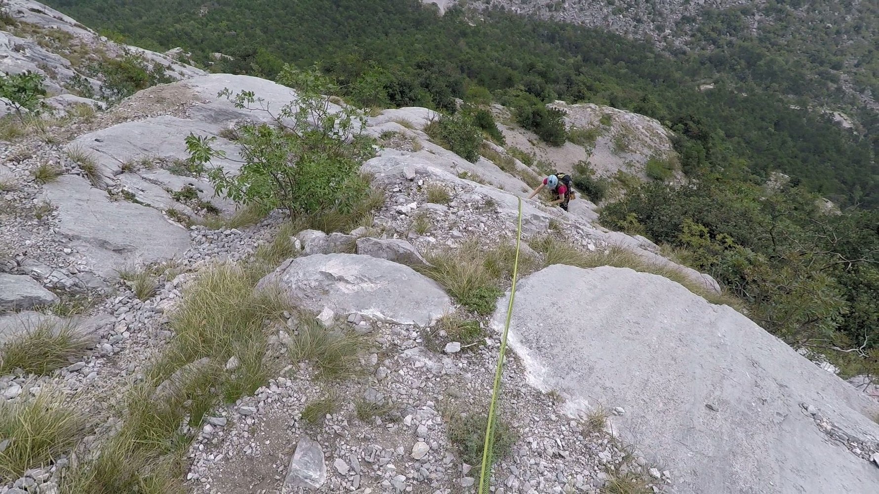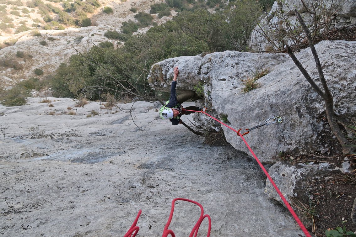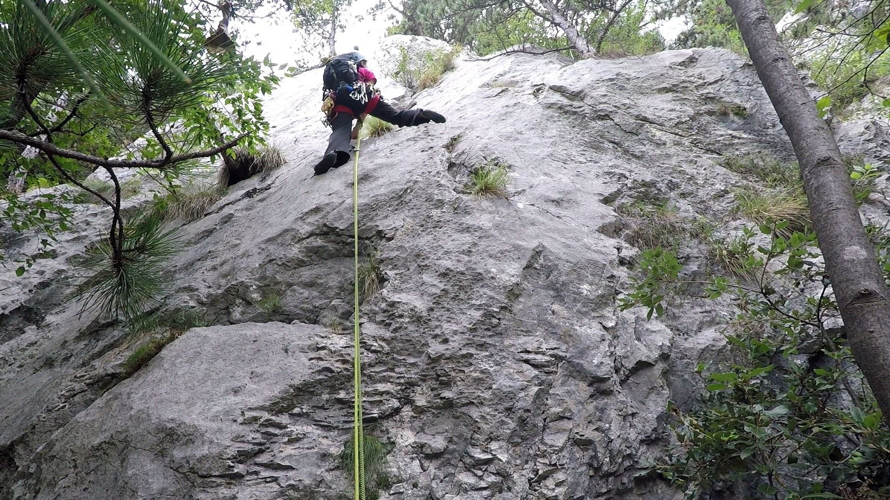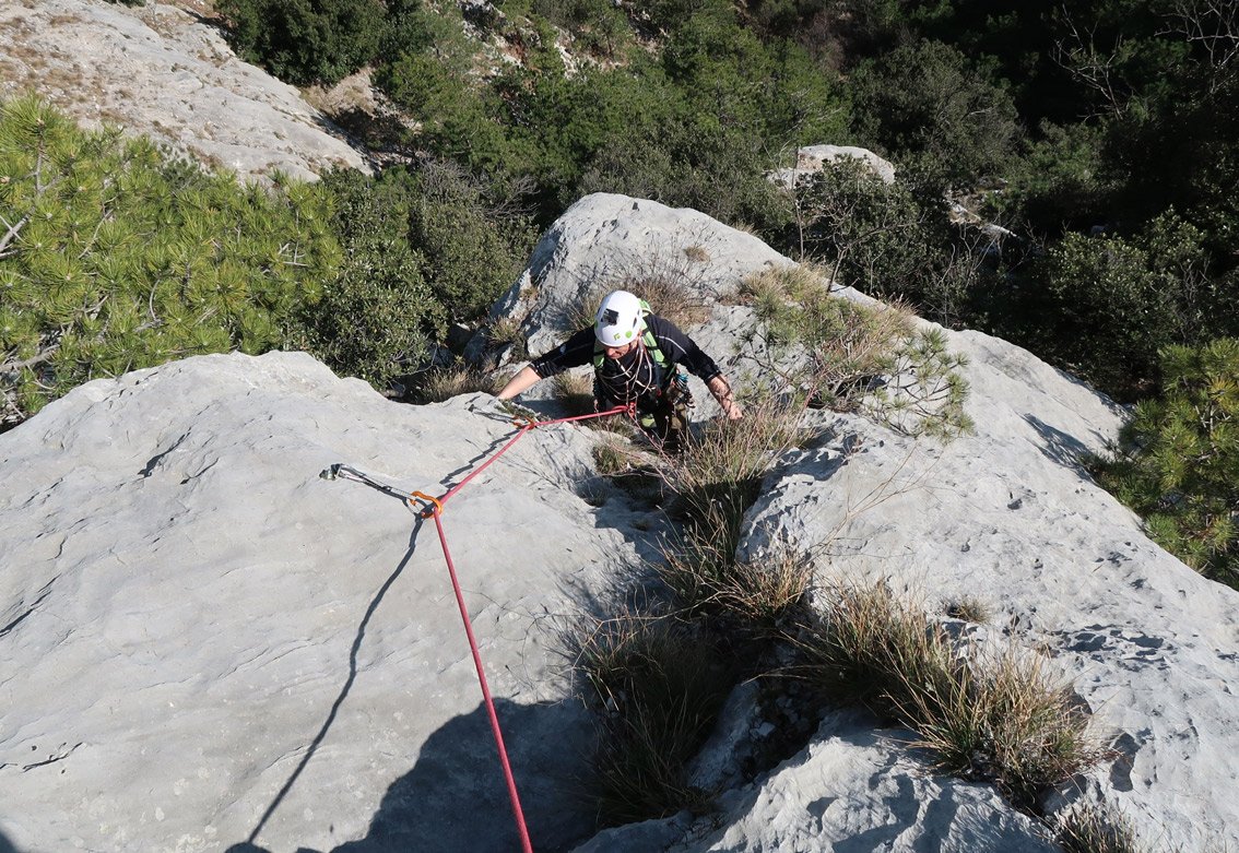 60 m Einfachseil, Helm, 14 Expressschlingen und einige Bandschlingen.