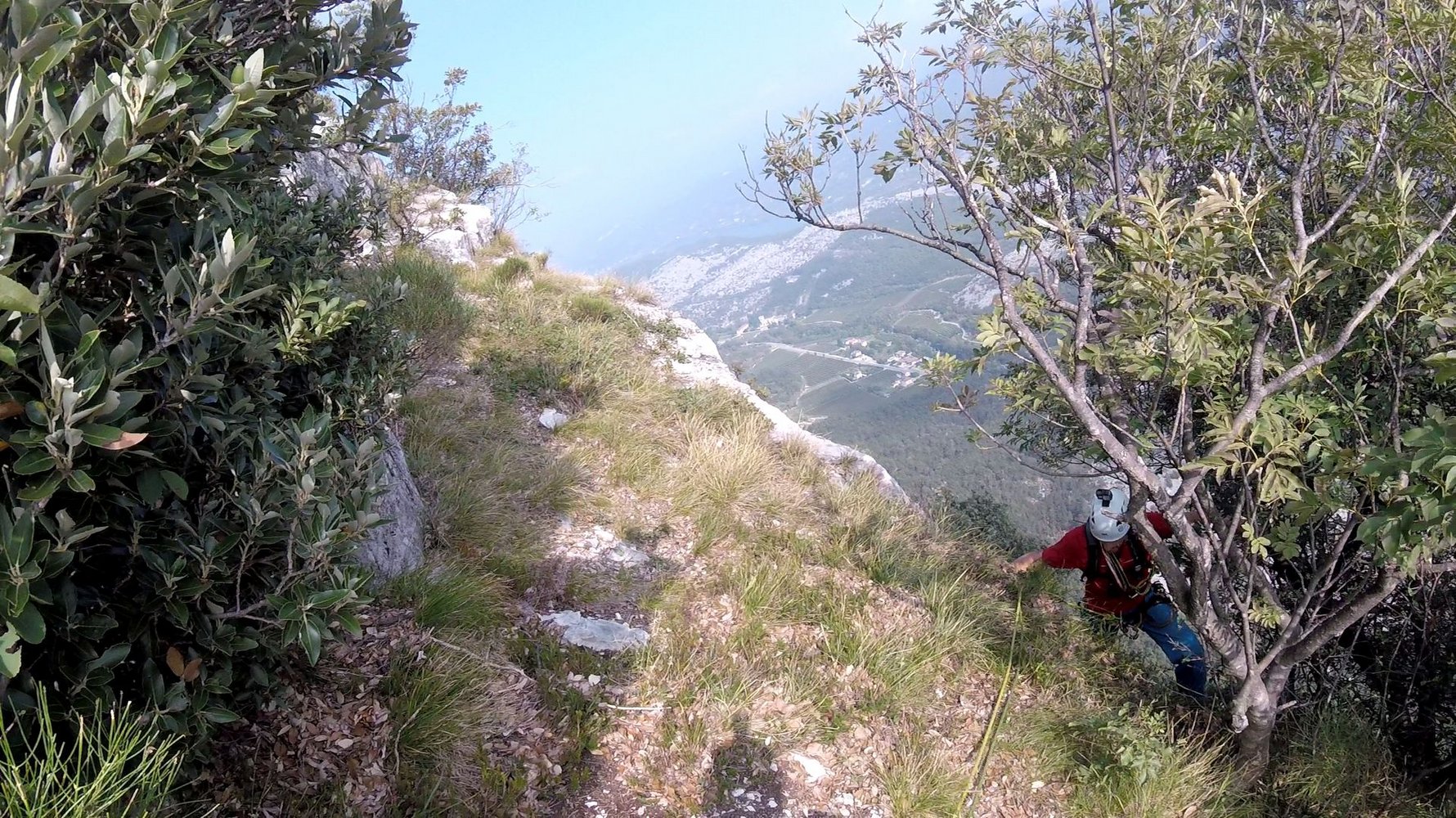 Vom Ausstieg durch Blockwerk nach links und waagrecht durch das Schuttfeld (Steinmänner). Man kommt zu flachen Platten (gespanntes, dünnes Stahlseil) und folgt dem mit Steinmännern markierten Pfad hinunter in den Wald. Unten trifft am auf einen leichten, versicherten Steig und steigt auf diesem über eine Wandstufe ab. Unten dann zurück zum Parkplatz.