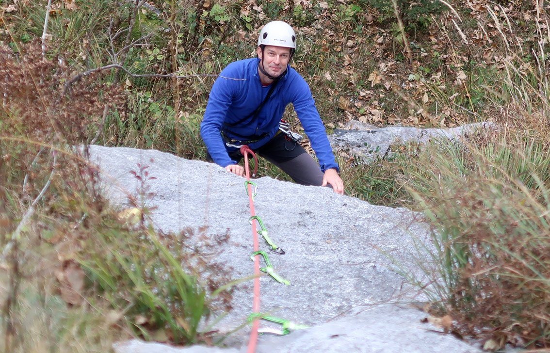 1 x 60 m Einfachseil, 11 Expressschlingen und Helm.