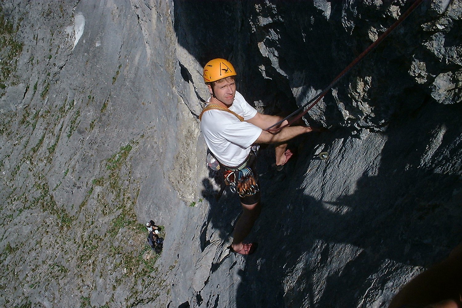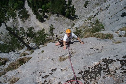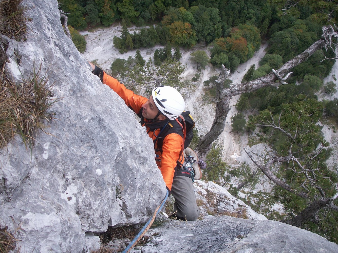 Rechts von der letzten Länge kommt die Nachbarroute Emperor herauf. Abseilen vom großen Baum über den Emperor oder den Richterweg kurz weiter bis zum Stadelwandgrat und über das Gassel zurück zum Wandfuß. Abseilen ist besser.