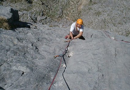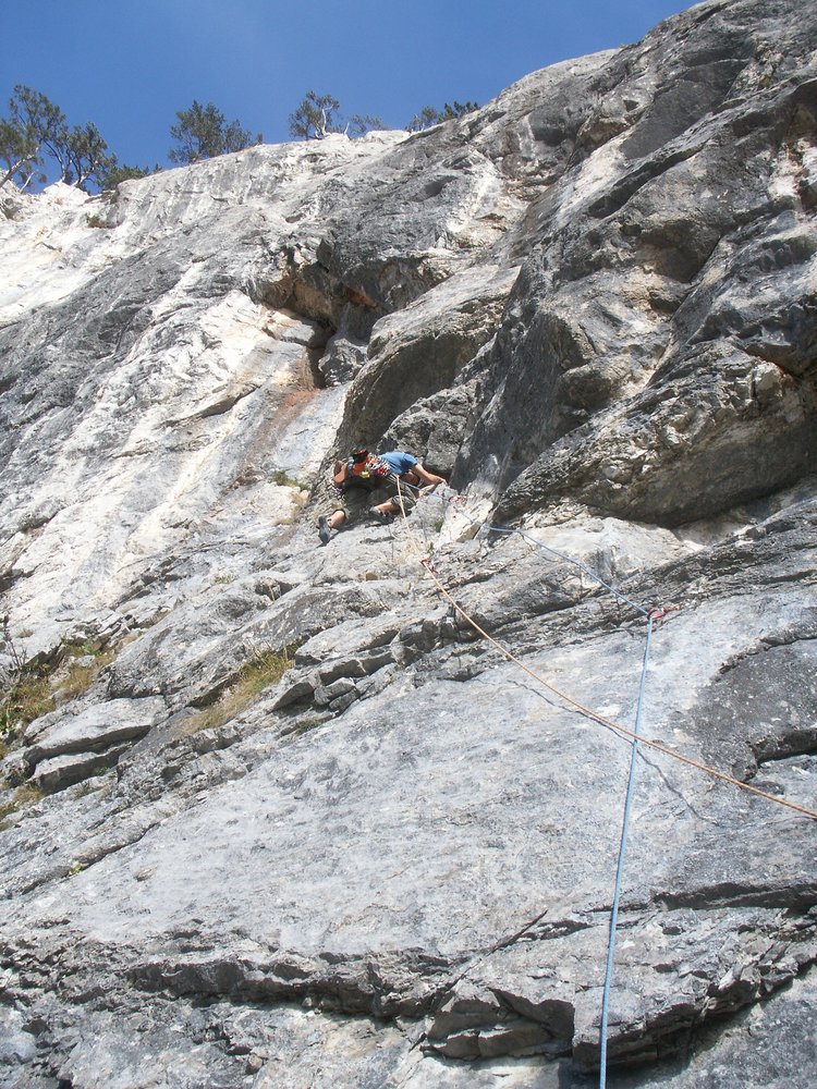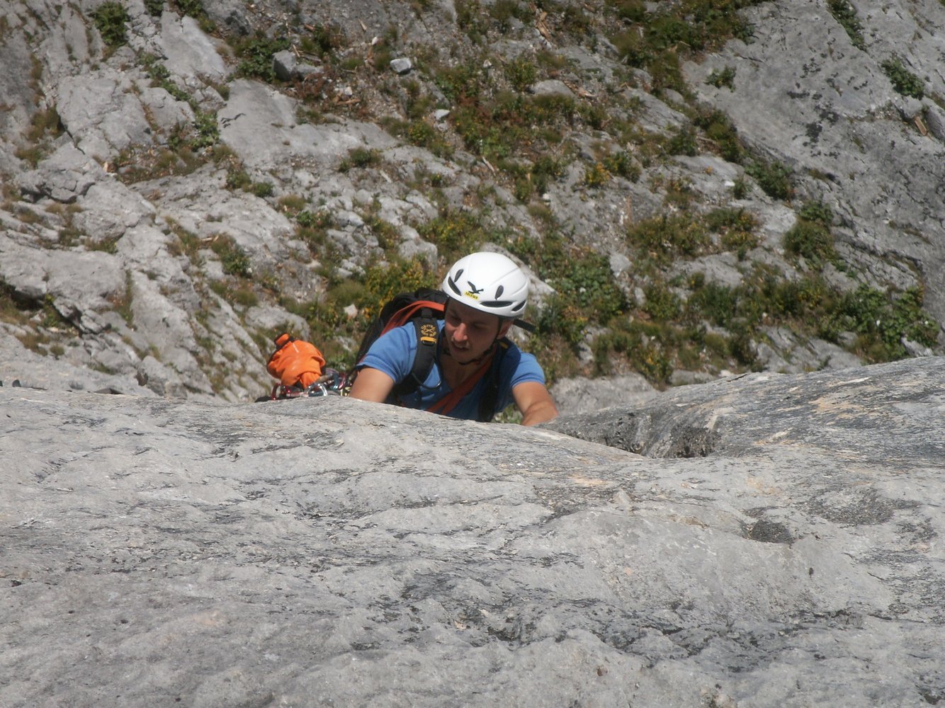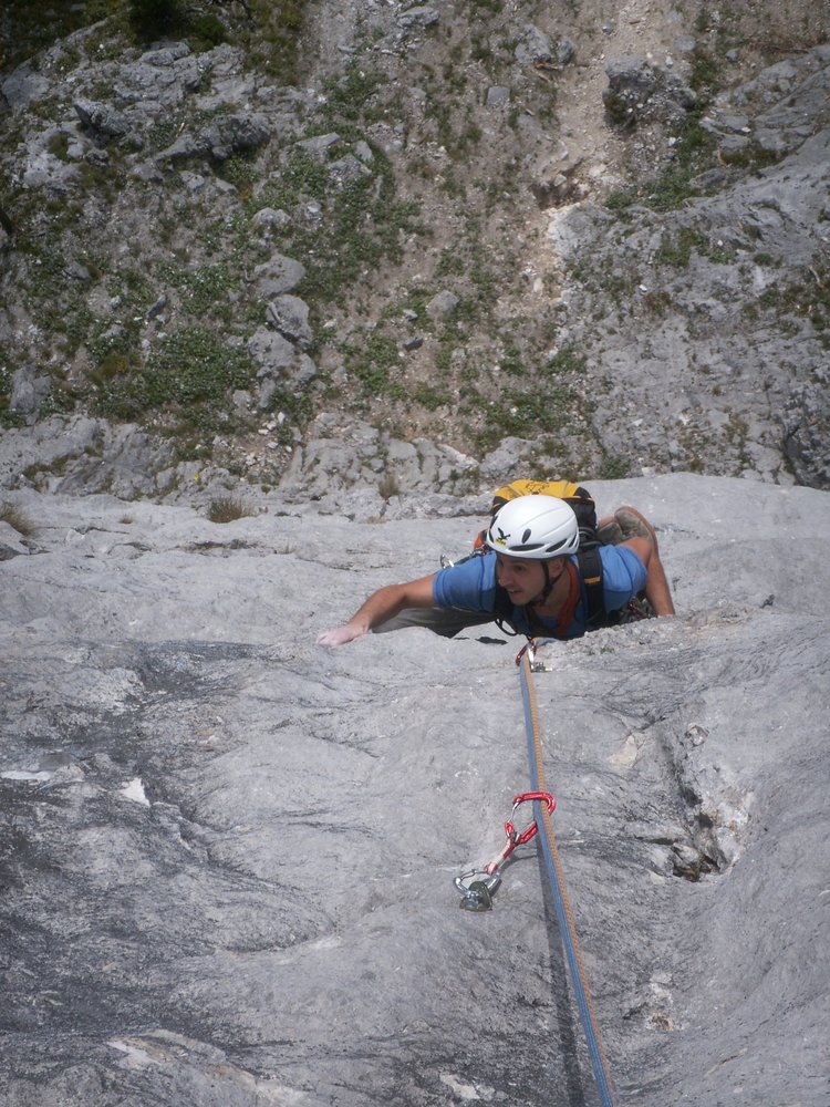 Die Route ist mit Bohrhaken, alten Normalhaken gesichert. In den leichten längen können gut Rocks u. Freinds gelegt werden.