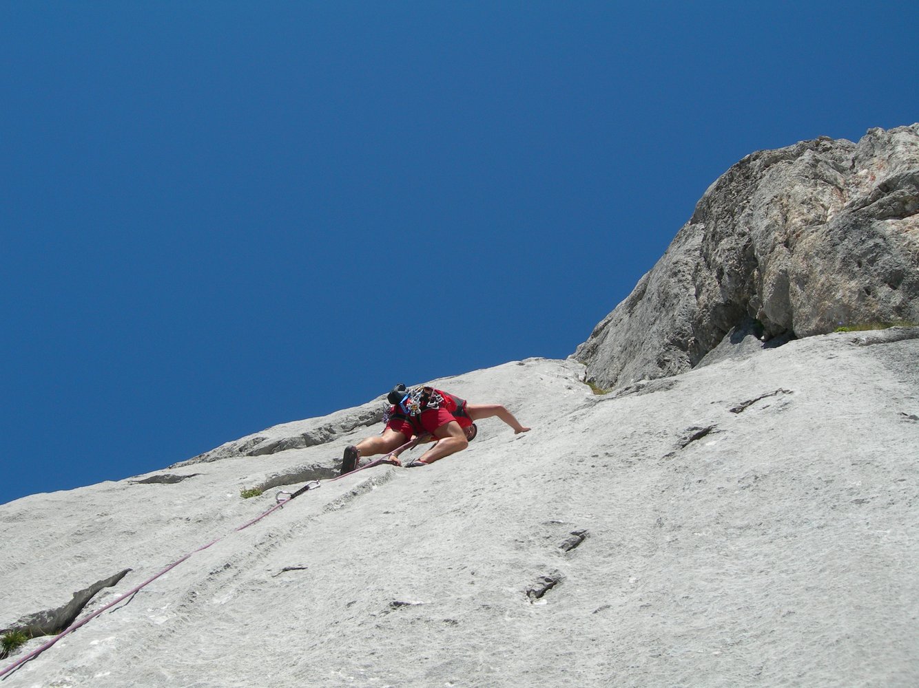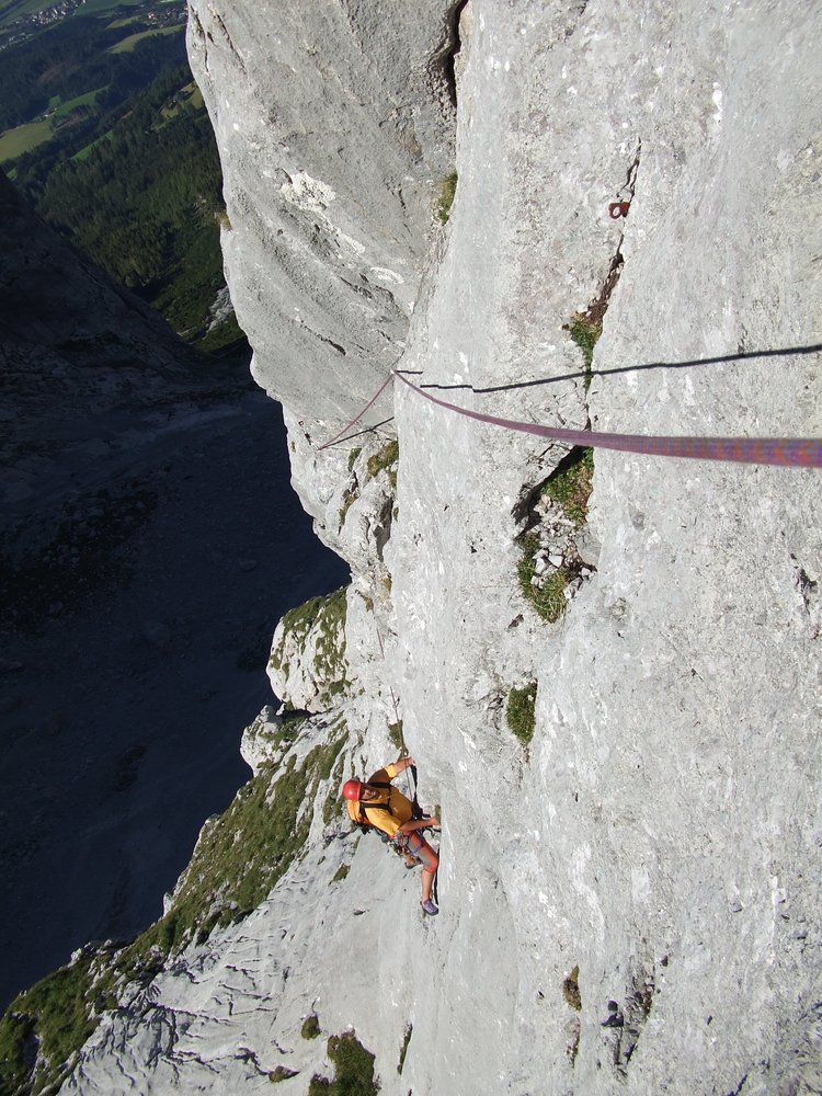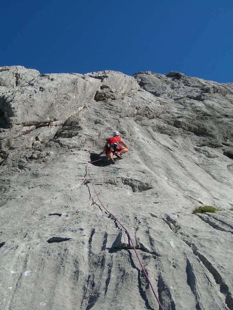 Wunderschöne Plattenkletterei an sensationellen Wasserrillen an der Südostwand des Hieflers. Die Route schlängelt sich über die schönsten Plattenpanzer der Südostwand und bietet recht abwechslungsreiche Kletterei an durchwegs festem Fels.