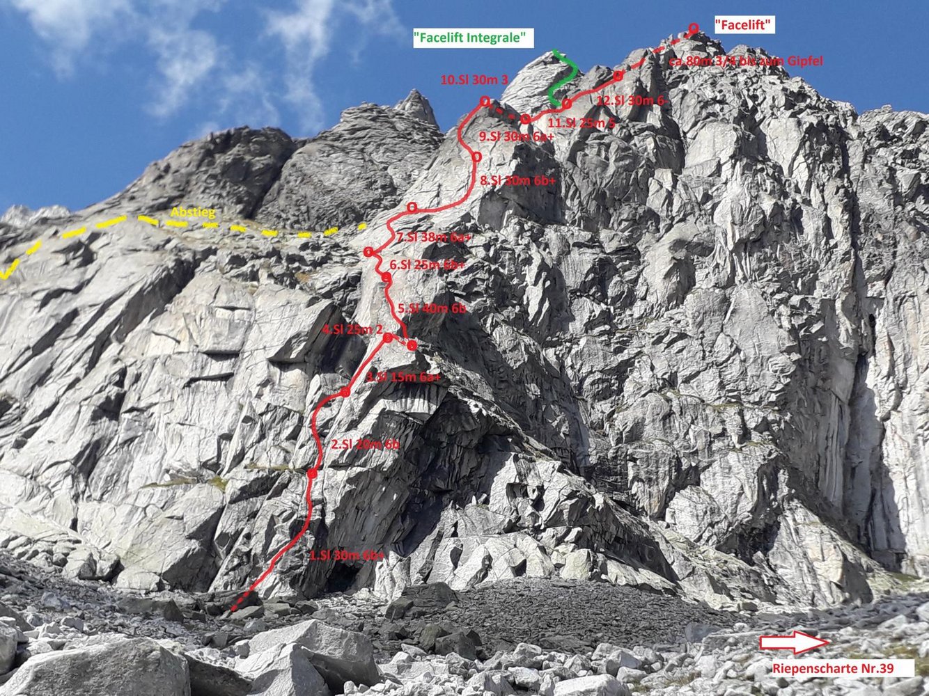 Bei der "Facelift" handelt es sich um sehr lohnende Kletterei in allerfeinsten Rieserferner Tonalit. Länge, Ambiente und Fels versprechen einen ausgefüllten Klettertag. Nachdem man den Zustieg nach ca. 1,5 geschafft hat, verpricht die Route genussvolles Höhersteigen entlang von sehr kompakten Platten und Rissen. Die Absicherung erfolgt über gebohrte Stand- und Zwischenhaken. Einige Passagen können mittels Friends problemlos entschärft werden. Der große Geröllgraben ermöglicht nach der 6. und eventuell 10. Seillänge einen recht unkomplizierten Rückzug zu Fuss. Der normale Ausstieg der Route verläuft sich nach der 12. Sl in Richtung Norden (3er Gelände) auf einen der Vorgipfel der Durrer Spitze. Überaus empfehlenswert ist der Ausstieg über die "Facelift - Integrale", die Manuel Gietl am 29.09. gemeinsam mit Jakbo Steinkasserer einrichten konnte. Nach der 12. Seillänge quert man in Richtung Westen über den breiten Graben. Am Fuße einer markanten Verschneidung kommt man dann noch in den Genuss, 6. Seillängen zu klettern. Der beeindruckende Fels und die eindrucksvolle Umgebung am Kleinen Hochgall runden den hoffentlich gelungenen Klettertag ab.