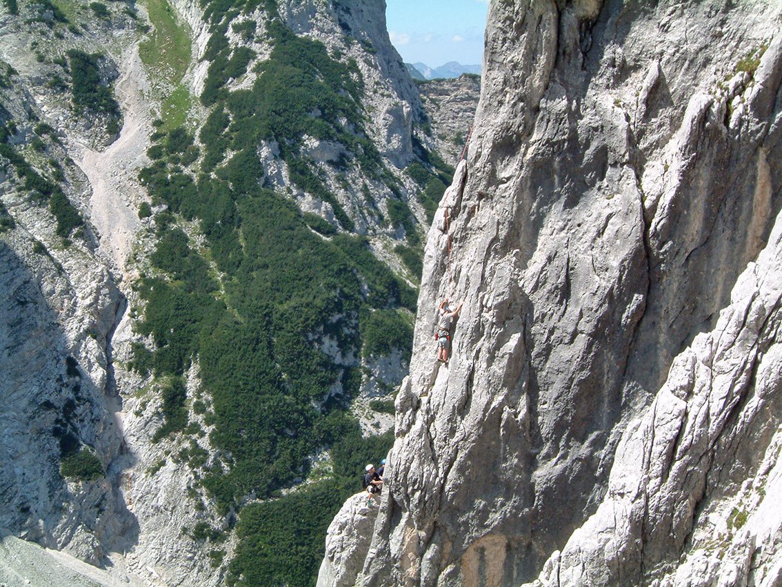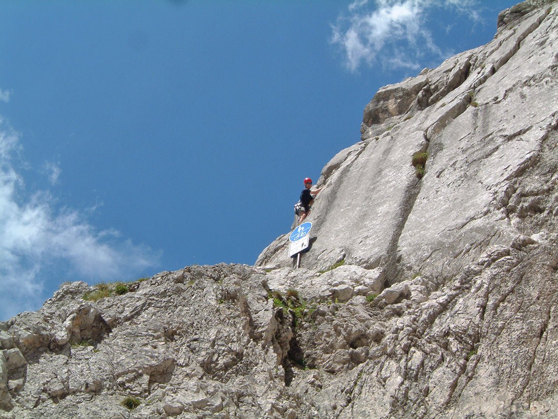 Die Fahrradlkant'n ist wohl der beliebteste Klassiker im Oberreintal. Die tolle Kante bietet neben festen Fels noch einige lustige Überraschungen, welche dann auch die Wartezeit - an schönen Tagen sind schon mal 25 Seilschaften an der Kante - verkürzen. Die Absicherung ist mit AV-Ringen an Ständen durchaus alpin, an den schweren Stellen jedoch gut. Die leichten Seillängen haben keine Zwischensicherungen. Klemmkeile, Köpfelschlingen und Friends können gut gelegt werden.