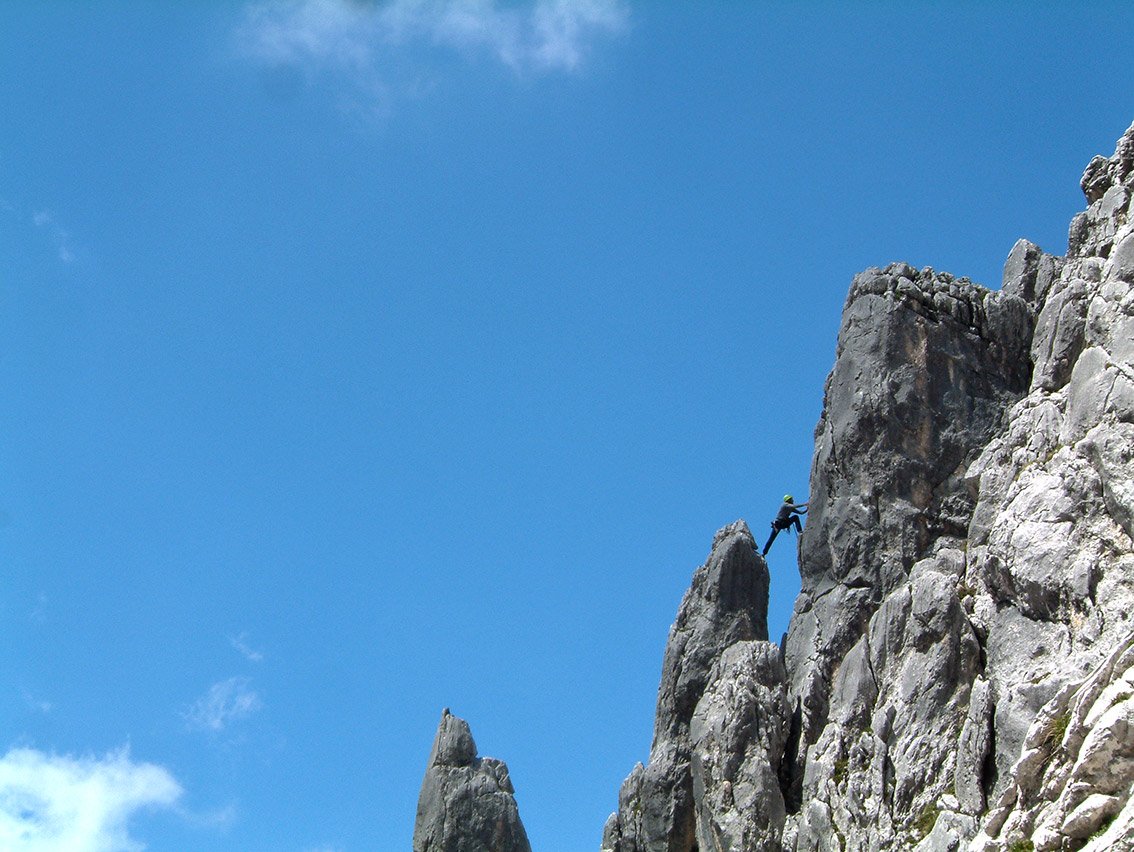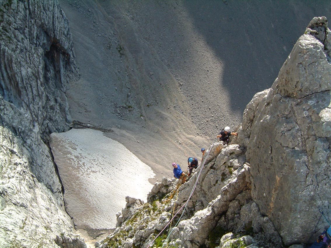 Vom BH auf einem flachen Schotterplatz noch ca. 150 m am Grat (1- 2, auch einzelne BH) zum unscheinbaren Gipfel. Von hier auf Steigspuren in eine Steilrinne (Stellen bis 1) hinab, vorbei an einem Felsenfenster zur 1. Abseilstelle. Nun 6 x 20 m hinab zum Einstieg.