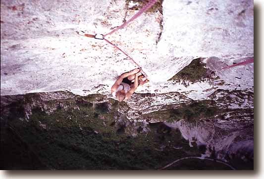 Sicher die längste und auch eine der besten Blechmauerrouten in dieser Schwierigkeit. Durch die perfekte Bohrhakenabsicherung wird ihr der Ernst jedoch etwas genommen. Den 7ten Grad sollte man allerdings beherrschen, um diese Konditionsprobe auch geniessen zu können. Achtung auf die Nachmittagssonne, die schon so manches Kletterherz vertrocknen liess. Rückzug: a) über den Schleihsweg abseilen (gebohrte Stände) Ab dem 10ten Stand entweder die Querung zurückklettern oder im Dangelweg zu BH queren (abseilen zu Stand Nr. 9) oder über Blechmauerenriße nach links ausweichen (=Kriechen im 4ten Schwierigkeitsgrad).