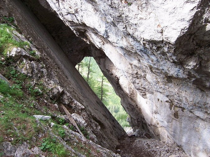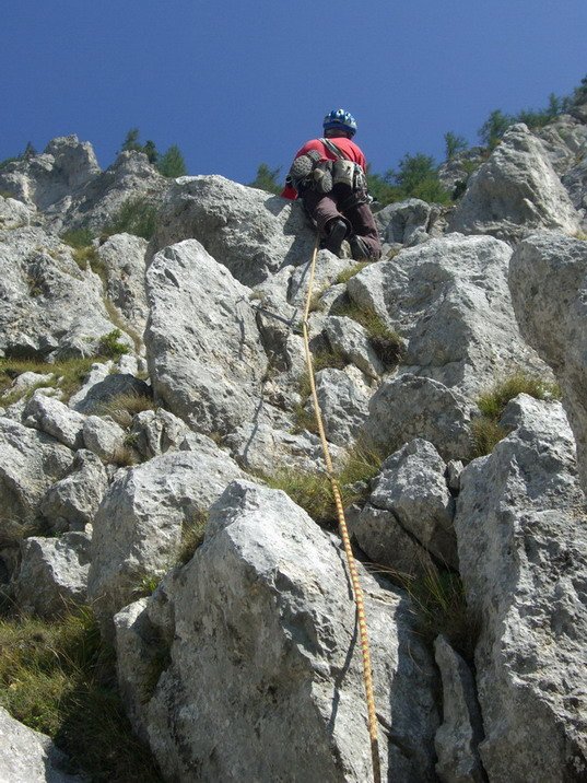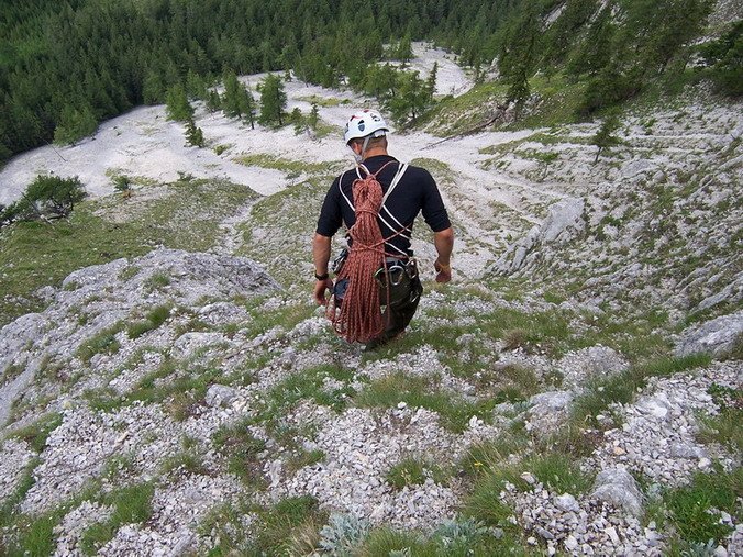 Vom letzten Stand einige Meter aufwärts auf ebene, bewaldete Wiese. Kurz nach links zum Felsenfenster. Durch dieses absteigen (evtl. am BH abseilen). Am Ende des Felsenfensters sofort nach rechts um die Kante (I-II) und kurz auf die Waldkuppe ansteigen. Von dort brüchige Schrofe (I-II) abklettern, danach taleinwärts queren und wieder abklettern Richtung Schuttrinne. Zuletzt über Geröll zurück zum Einstieg. Die gelben Markierungen beim Abstieg sind schon sehr ausgebleicht. Trittsicherheit erforderlich!