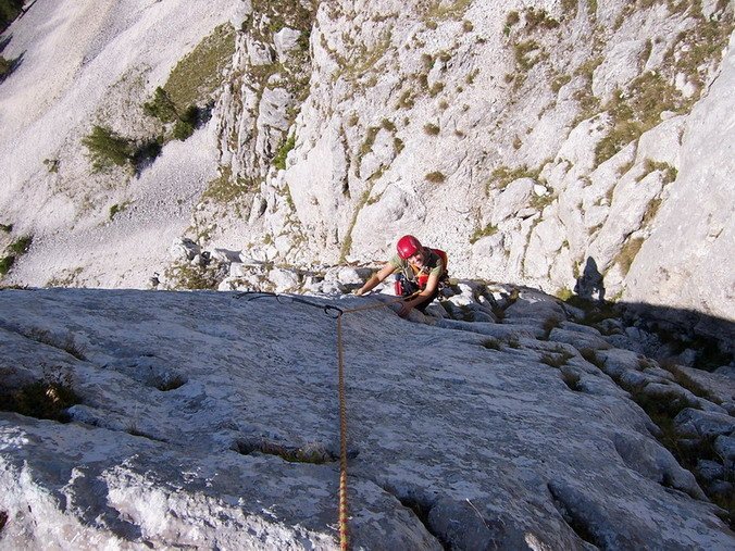 Die Tour ist mit Ausnahme der 2. (leichten) SL ausreichend mit BH und SU-Schlingen abgesichert. In der 3. SL unbedingt die ersten beiden Haken verlängern, ansonsten starke Seilreibung!