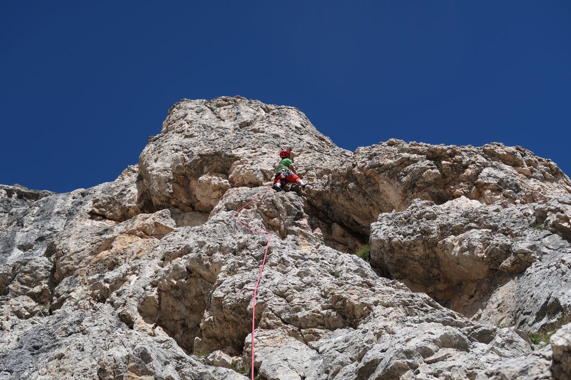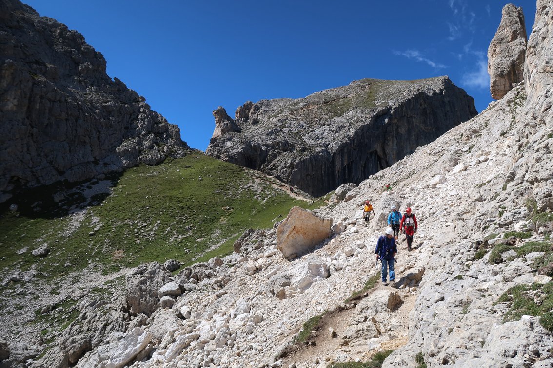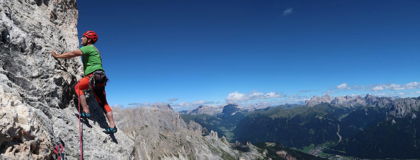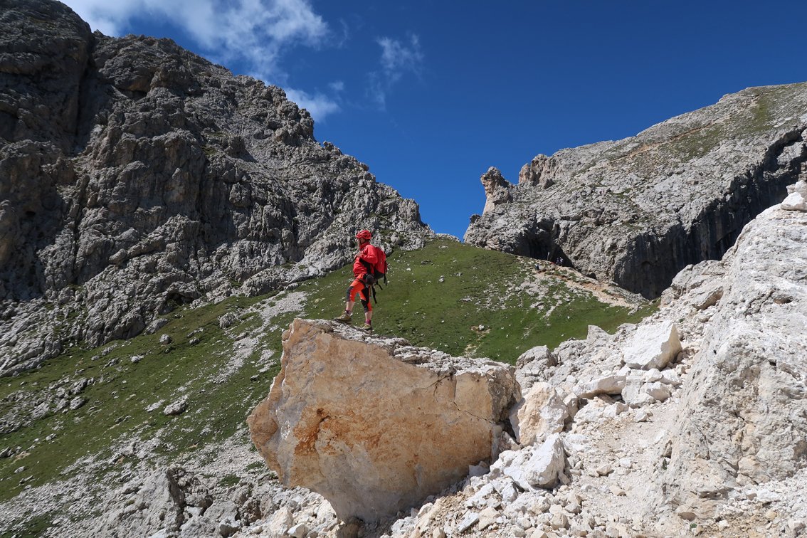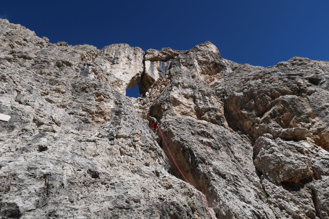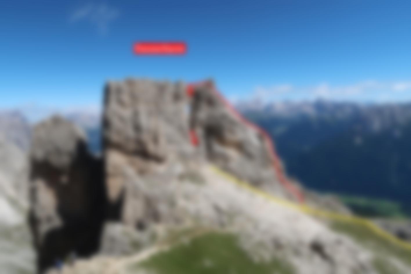 Obwohl der berühmte "Rüssel" im Gipfelbereich ins Tal gestürzt ist die Südkante immer noch ein oft begangener Dolomitenklassiker, der schöne Genusskletterei bietet. Highlight ist die luftige Abseilfahrt direkt über das Felsenfenster (Fensterl), dabei ist man immer im Blickfeld der meist zahlreichen Rotwandklettersteiggeher.