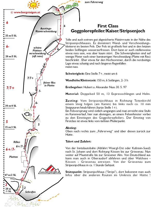 Vom Stripsenjochhaus in Richtung Totenkirchl einem Steig folgen (am Kamm) bis links nach ca. 10 min Steigspuren hinab führen (kurze Stelle 1+). Ein Felsvorsprung wird östlich umgangen und man erreicht eine Stufe im Kammverlauf, hier nun absteigen, an einem Felsenfenster vorbei zu den Einstiegen des Goggolorepfeilers. Der Einstieg von Firstclass ist etwas links vom tiefsten Pfeilerpunkt.