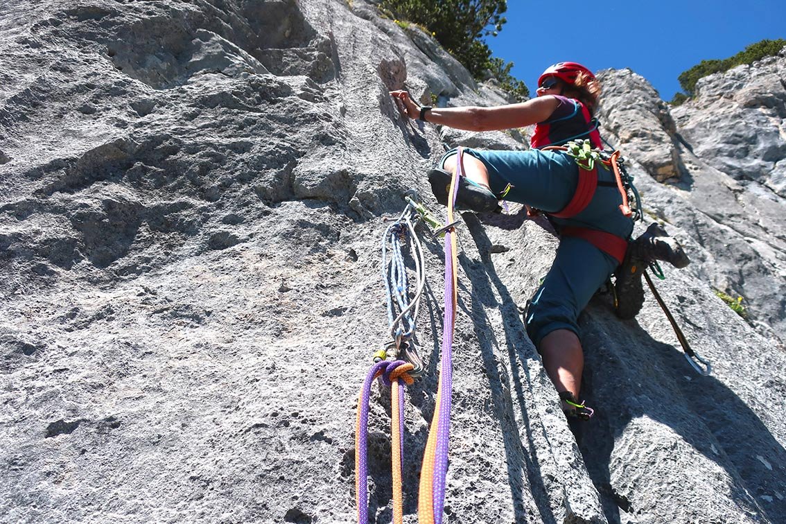 2 x 60 m Doppelseil, 10 Expressschlingen und Helm.