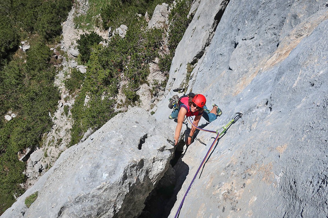Vom Ende der Route seilt man zum Einstieg ab und geht auf dem bekannten Zustiegsweg zurück ins Tal.