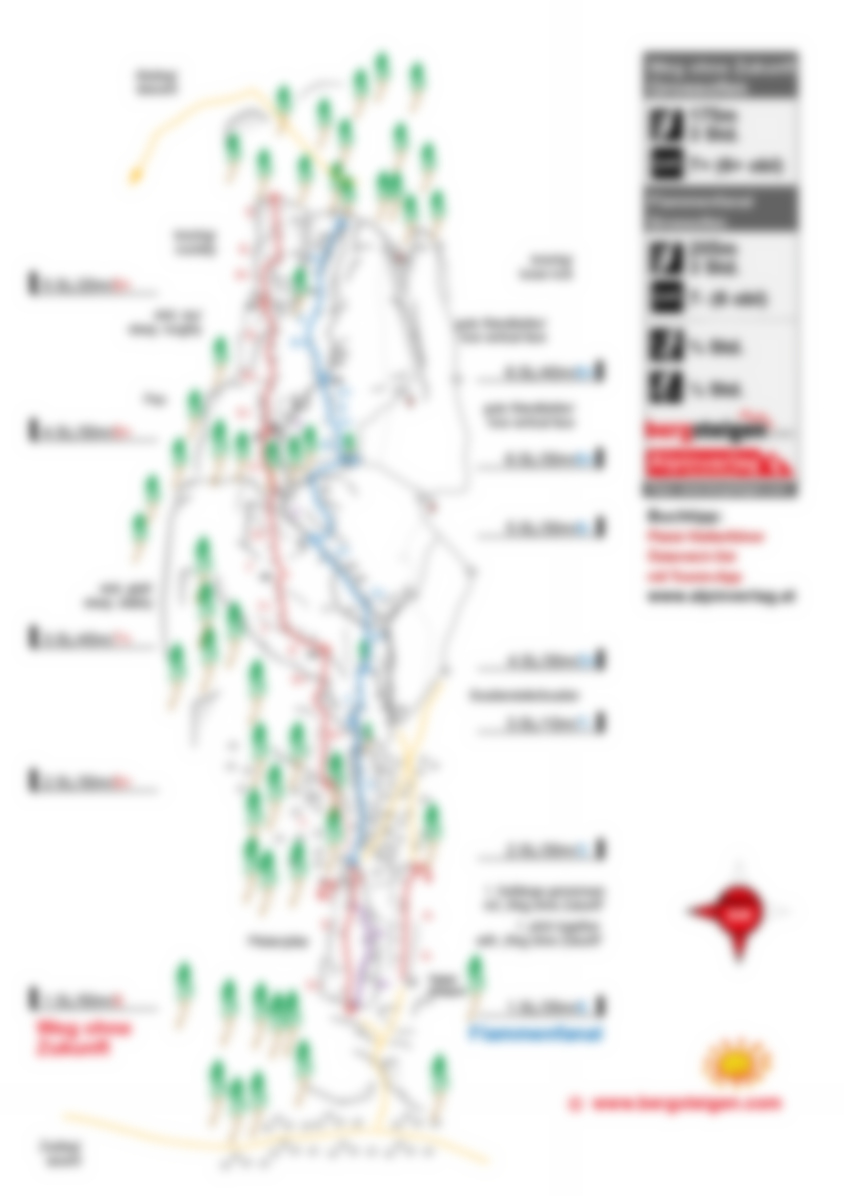 Am Ausstieg orographisch rechts (im Sinne des Aufstieges links) einem Weg, tw. Kletterei bis 1, in eine sich unten verjüngende Geröllhalde folgen (Pfadspuren mit Steinmännern). Durch sie zurück zum Einstieg (15 min.). Direkt vom Einstieg über die wohl sensationellste Geröllabfahrt direkt zur Schwarza (10 min).