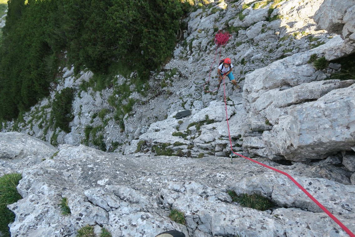 Stände oft gebohrt, div. Bergrettungshaken auf dem Grat und dazwischen auch alte Normalhaken.