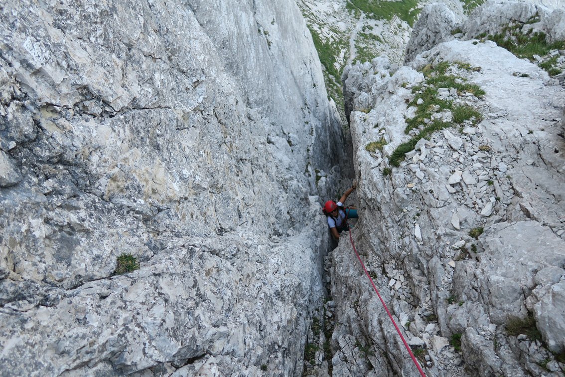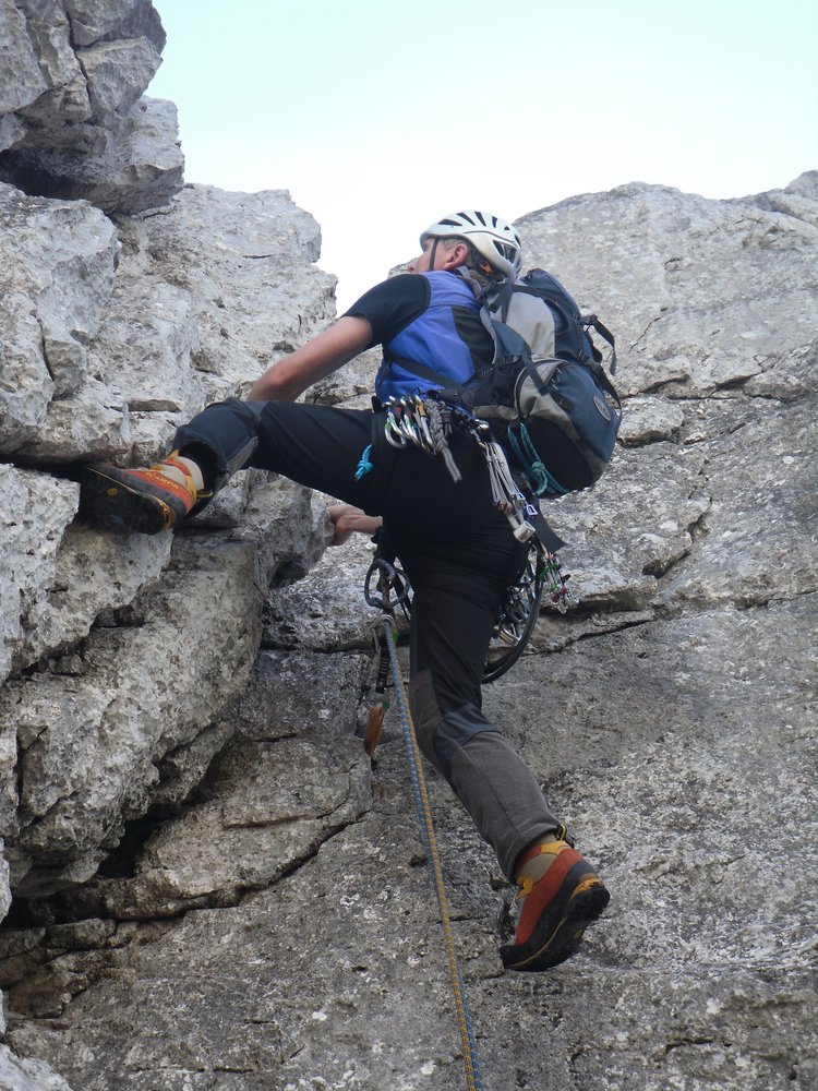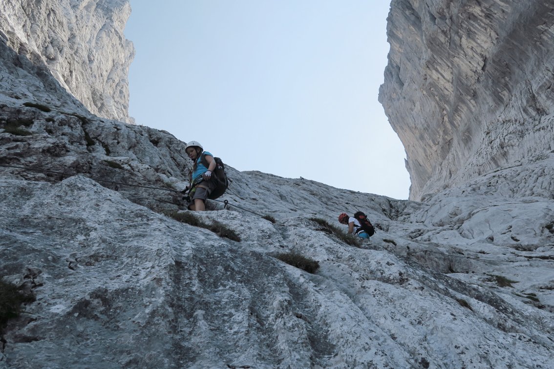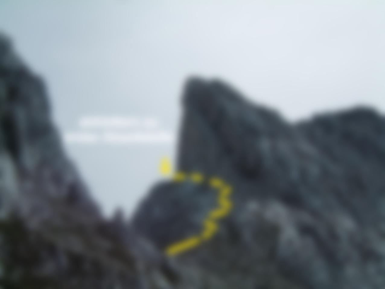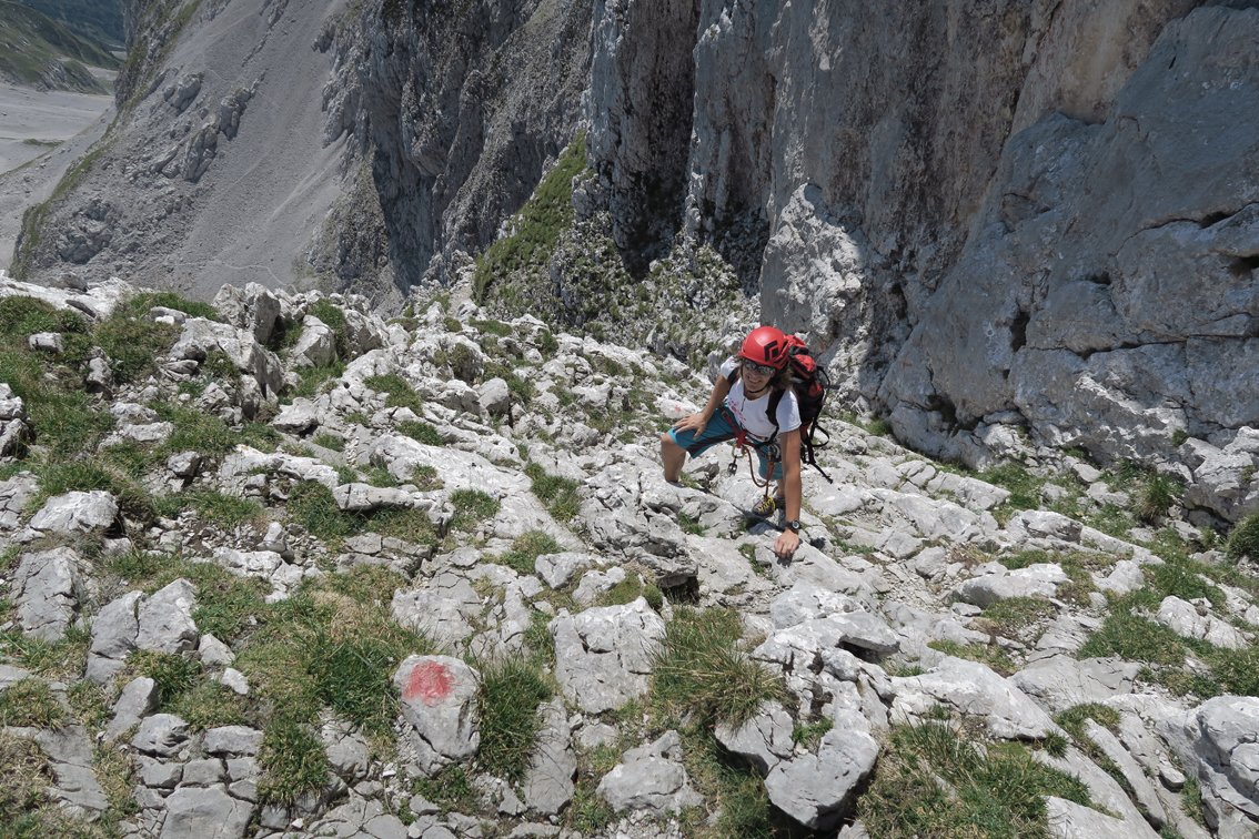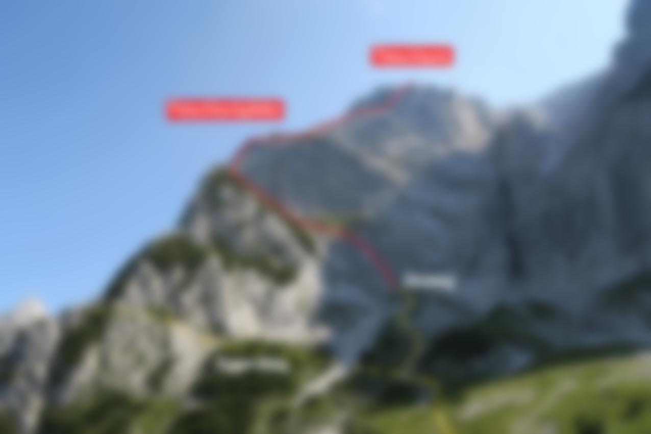 Durch eine Kaminrinne ca. 55 m empor (unten 2, kurz vor dem Ausstieg 3/3+, oben alte Haken) bis auf einen Absatz. Dort weiter entlang von Steigspuren aufwärts bis kurz vor die Gratkante (1-2, Schotter und Platten). Bei einer Gedenktafel direkt über eine Wandstelle hinauf (Normalhaken, 3+), dann immer im Bereich des Grates weiter (Stellen 3) bis das Gelände leichter wird. Man folgt den Steigspuren ca. 500 m bis zu einer großen Wandstufe (rote Markierung). Diese wird eher rechts über eine Rampe (2 x 40 m, 2) überklettert. Danach wird das Gelände wieder leichter, man folgt den Spuren und der roten Markierung hinauf zum Grat. Über Türme und Stufen (Stellen 3) bis unter den Gipfelgrat und dort direkt hinauf zum Gipfelkreuz (3-).
