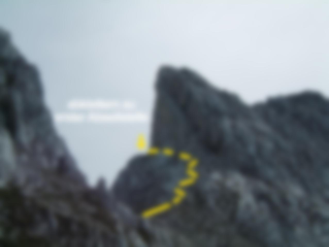 Von der Griesner Alm in Richtung Stripsenjoch bis in den "Wildanger", das ist ein Flachstück mit Wiese vor der letzten Steigung zur Hütte (dort ist auch die Abzweigung des Eggersteiges in Richtung Ellmauer Tor). Auf der Wiesenfläche dem Eggersteig bis unter die Wand folgen und rechts von dieser bis zu kaminartiger Rinne aufsteigen.