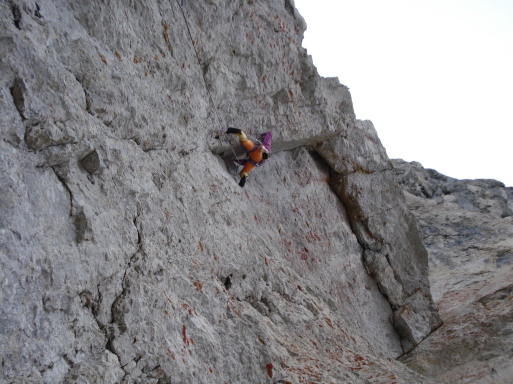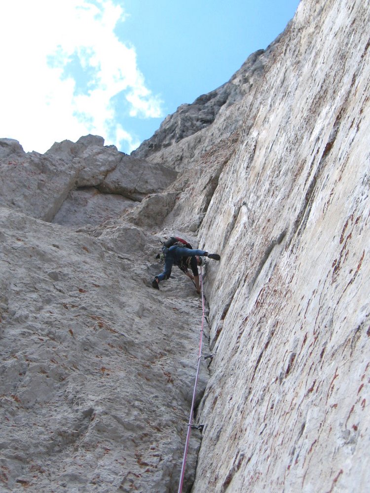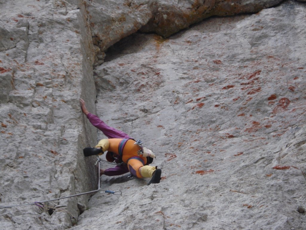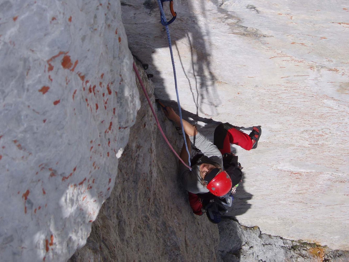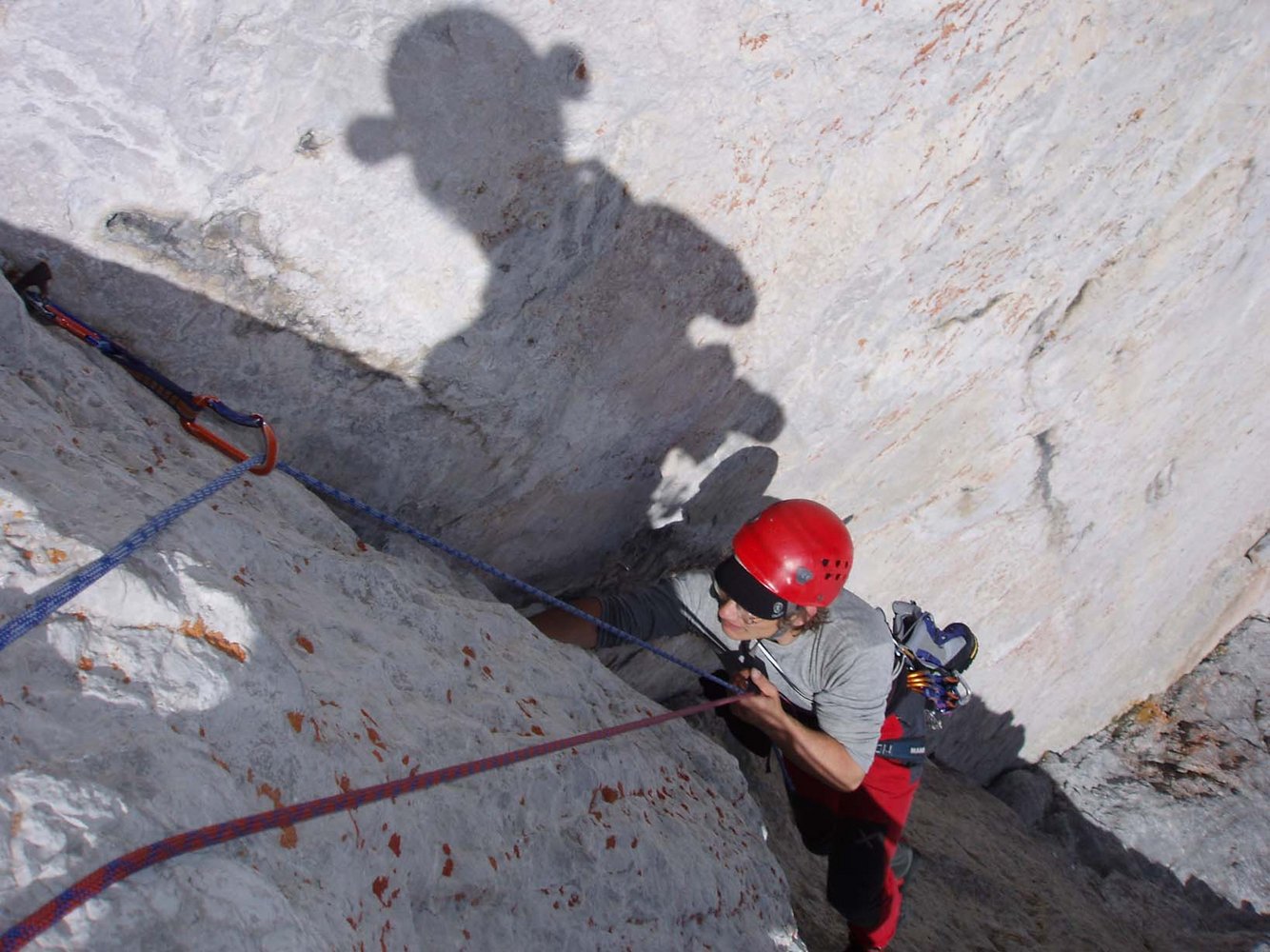Die Sonne verschwindet so um 13.30, dann hat man die etwas einfacheren Längen vielleicht hinter sich und es herrschen im Sommer optimale Bedingungen. Die Normalhaken sind nur z.T. schlecht: in der berühmten Verschneidungsseillänge sind sie sogar erstaunlich gut.