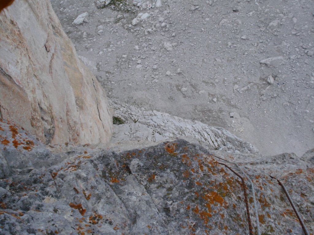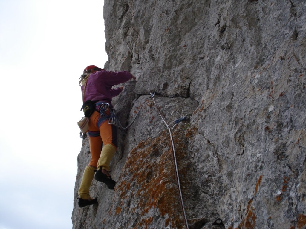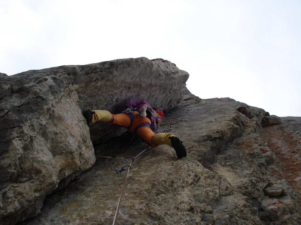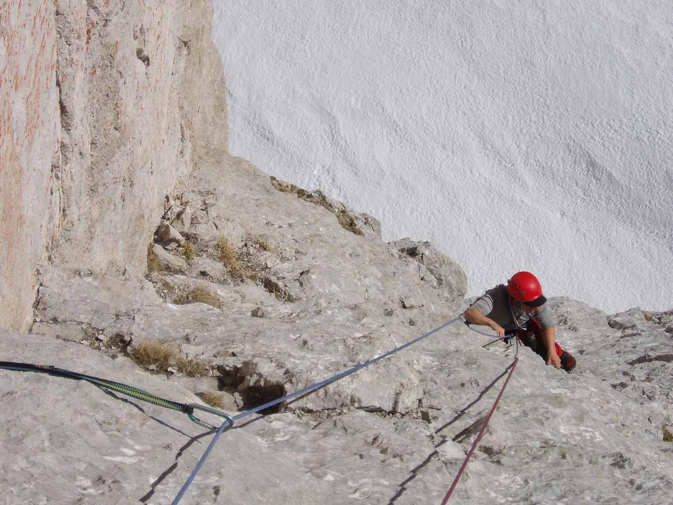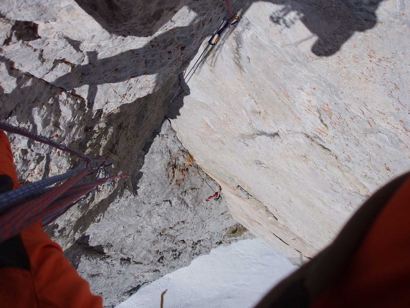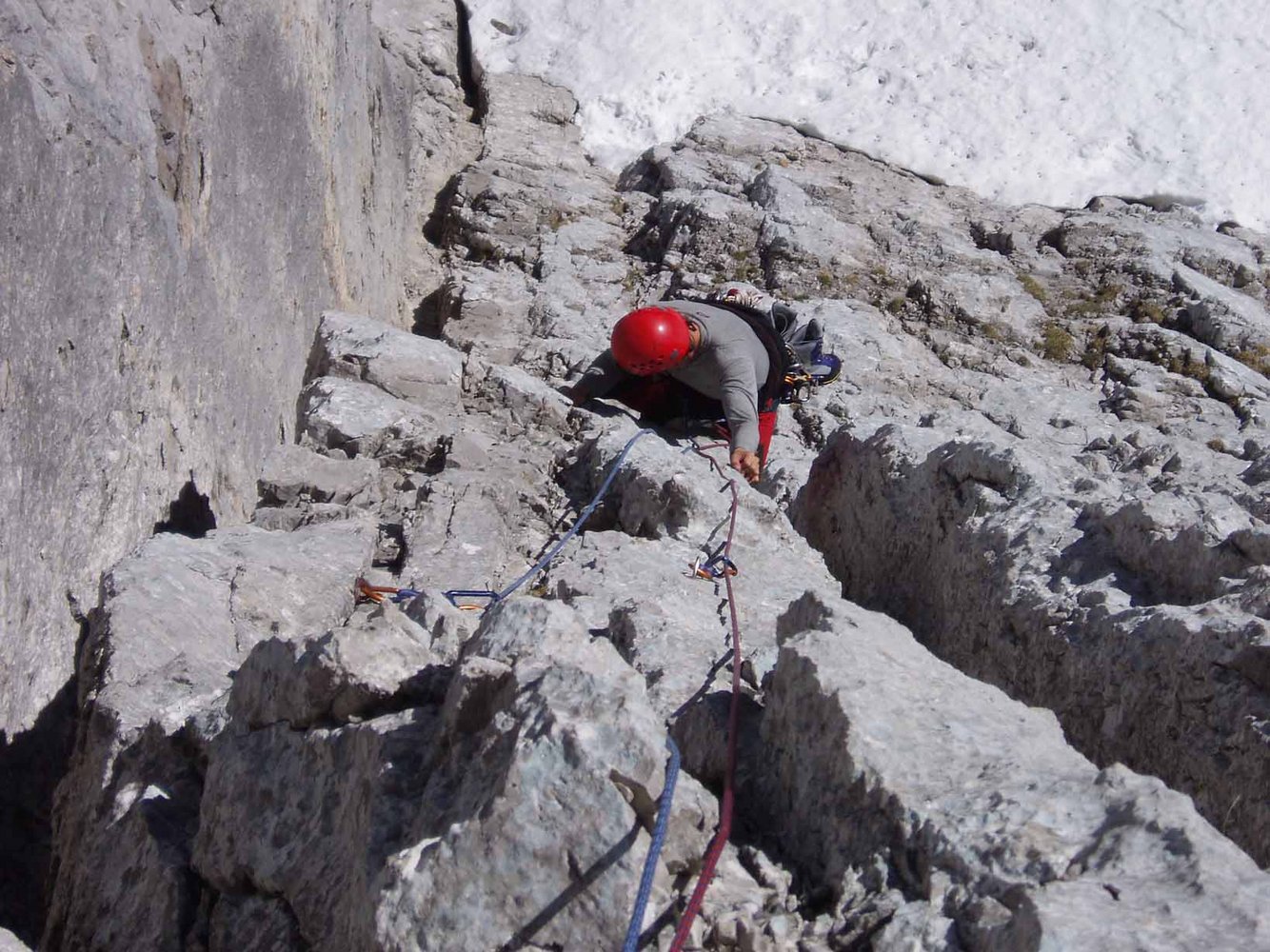 Die Sonne verschwindet so um 13.30, dann hat man die etwas einfacheren Längen vielleicht hinter sich und es herrschen im Sommer optimale Bedingungen. Die Normalhaken sind nur z.T. schlecht: in der berühmten Verschneidungsseillänge sind sie sogar erstaunlich gut.
