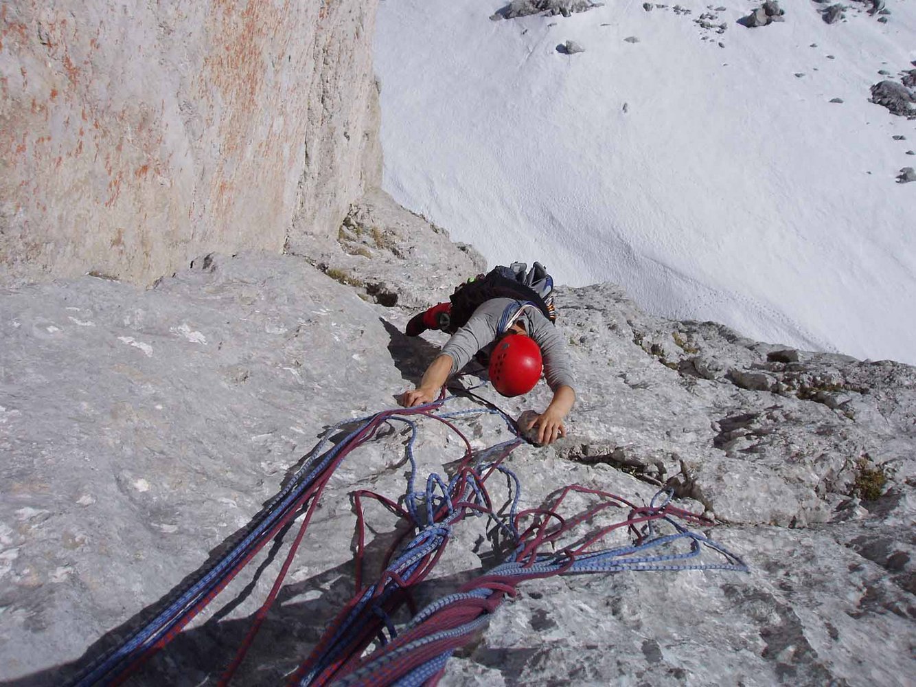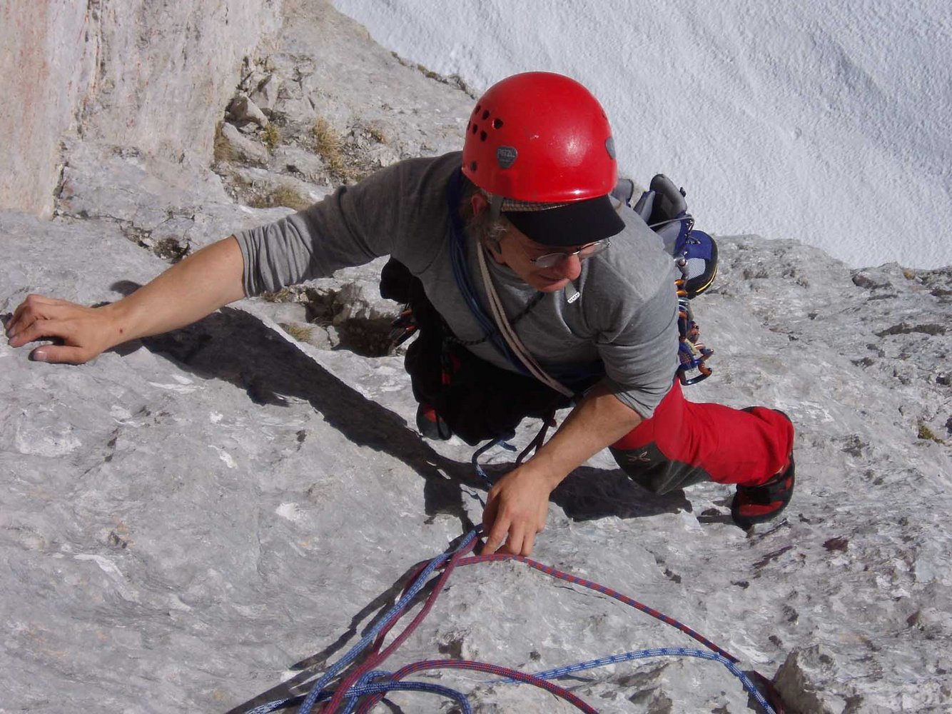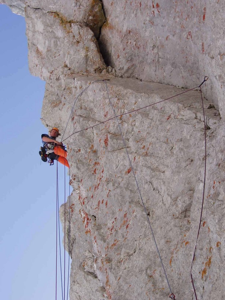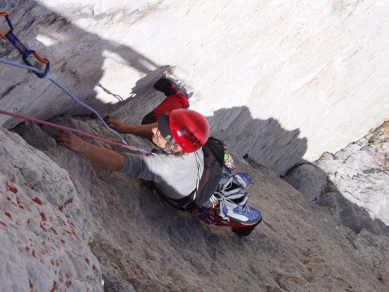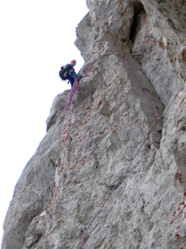 Die Sonne verschwindet so um 13.30, dann hat man die etwas einfacheren Längen vielleicht hinter sich und es herrschen im Sommer optimale Bedingungen. Die Normalhaken sind nur z.T. schlecht: in der berühmten Verschneidungsseillänge sind sie sogar erstaunlich gut.