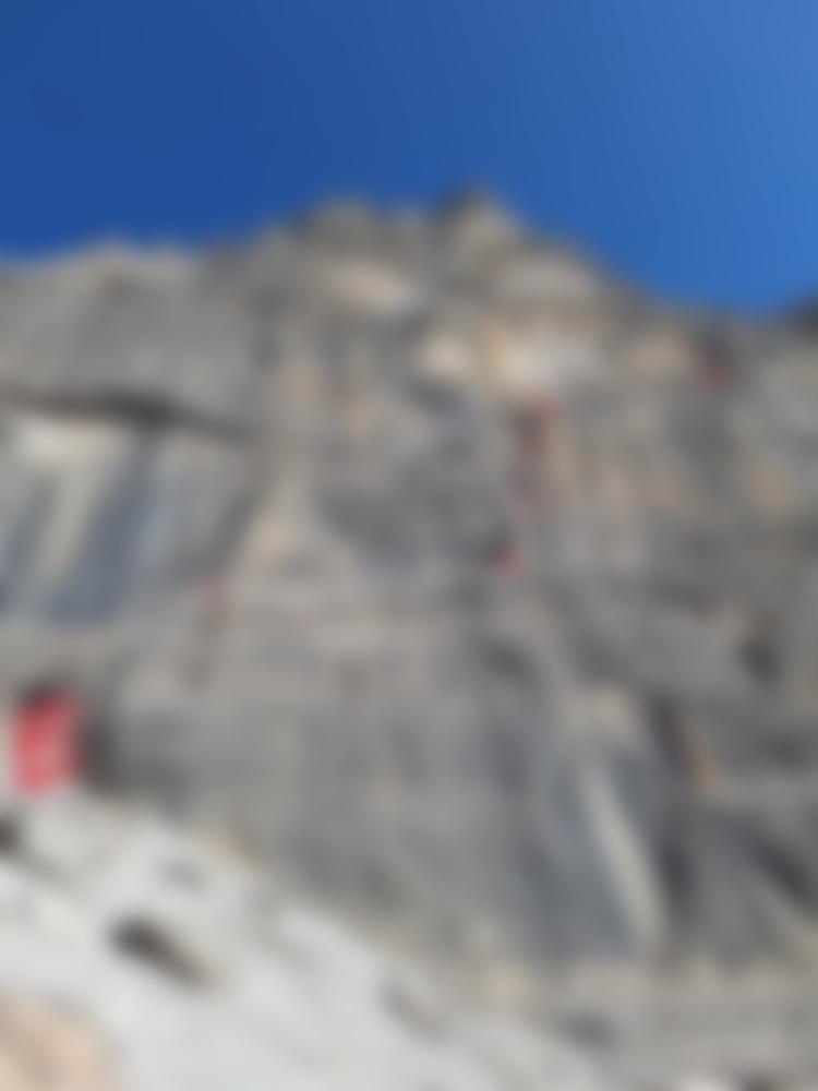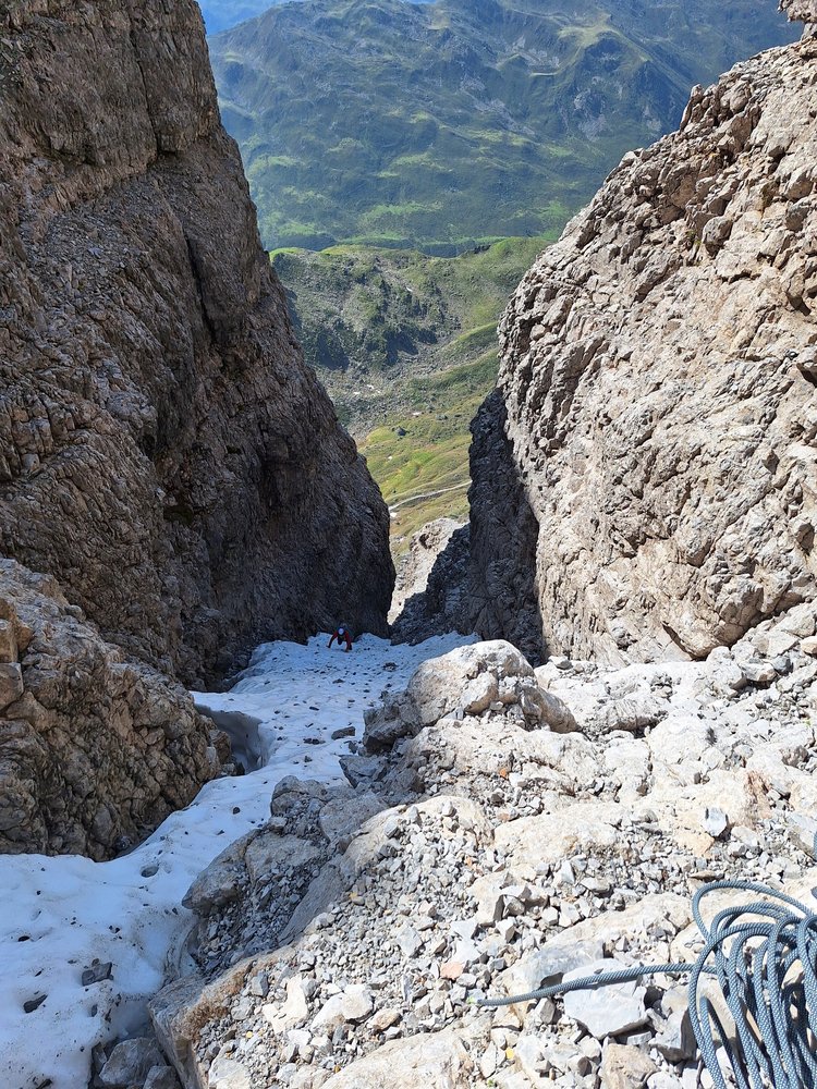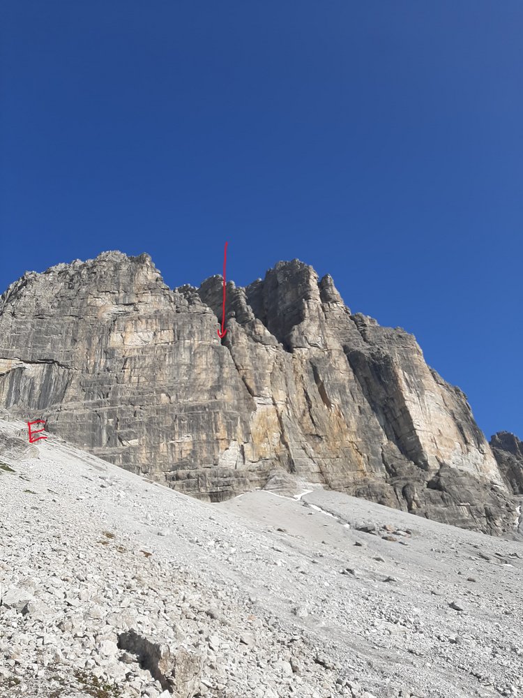 In der Rinne entweder links in die Verschneidung (meist nass) oder rechts brüchig (1 Haken) bis man im Schutt ankommt. Ab hier aufpassen auf starken Steinschlag!! Danach immer linkshaltend in der Rinne stellen bis III , ca 250meter bis zum Nordgrat. Diesen hoch zum Gipfel.