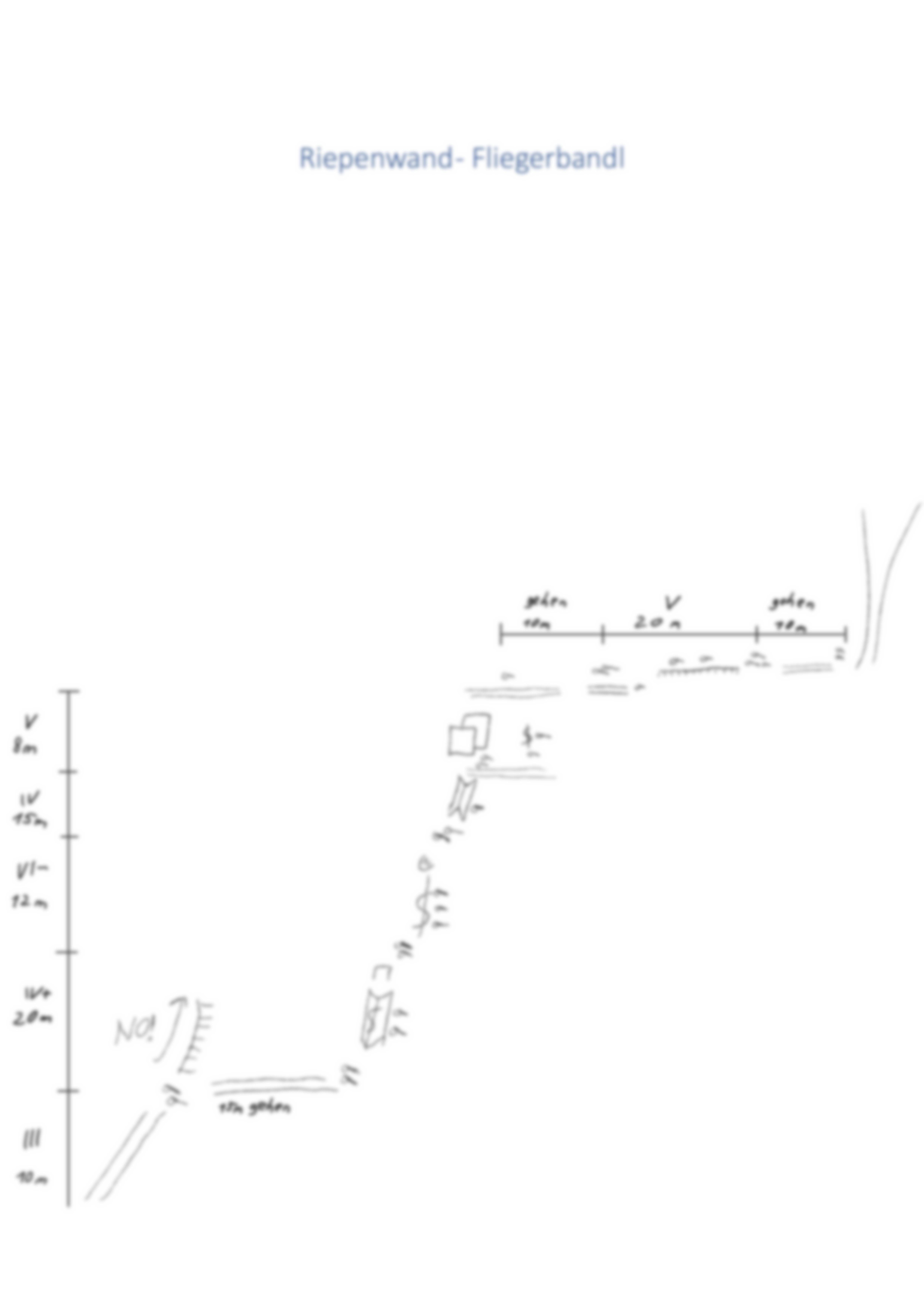 Über eine Rampe Seilfrei zu Stand (sichtbar von unten) auf einem Band. Dieses nachts rechts ca 15 Meter folgen zum eigentlichen Start der Tour (Stand aufbesserbar mit 4er Cam). Erste Seillänge folgen bis auf ein Podest mit 2 Normalhaken. Dann folgt die Schlüssellänge mit mehreren Haken. Nach der Schlüssellänge unschwierig auf ein Band. Hier entweder rechts (2 Haken) oder links (ohne Sicherungsmöglichkeit dafür etwas leichter) auf das Fliegerbandl. Dort angekommen ein Haken (protect your follower), bevor rechts nach 10 Meter der Stand vor dem schönen Hangelquergang kommt. Auf gleicher Höhe bleibend (ein erster Haken steckt auf Fußhöhe) entlang bis ein Stand (3 Haken) kommt, welcher für Fotos gut geeignet ist. Sonst unschwierig weiter bis Stand vor der Ausstiegsrinne.
