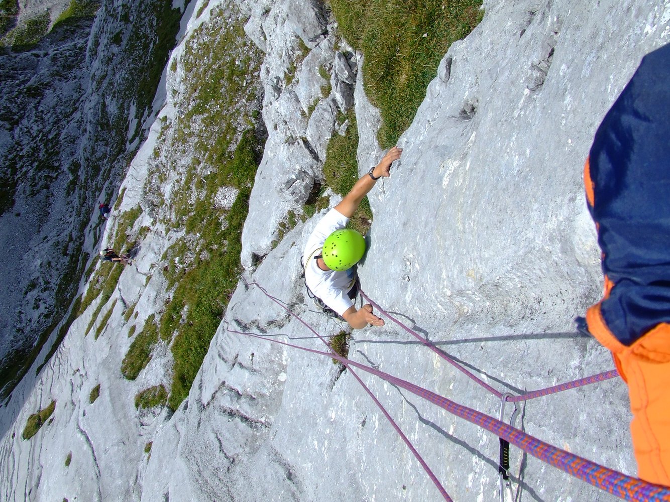Empfehlung: Am besten weiterklettern über die Route Panorama auf das Große Fieberhorn, -V, Ao, sehr gut abgesichert;