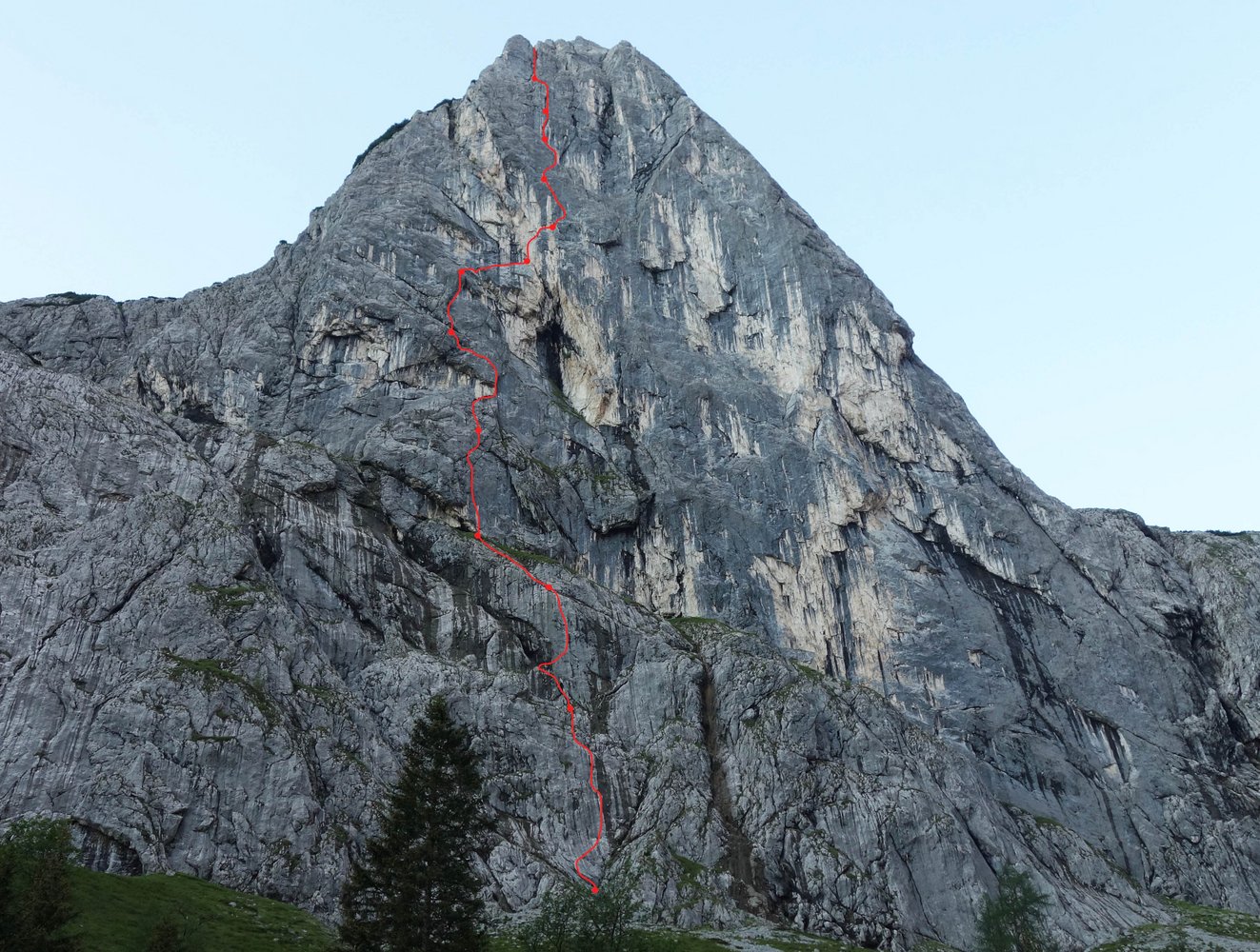 Die Erstbegehung erfolgte in freier Kletterei, inspiriert vom Großmeister Scheel M. bedeutet das, dass die Haken dort sitzen, wo man leicht bohren kann, nicht zwangsläufig dort, wo es für Wiederholer besonders mühelos ist. Die vielen Risse wurden bis auf eine Ausnahme aufgrund eines nicht vorhandenen 5er Camalot, clean belassen.Die Route ist nach Einschätzung der ersten Wiederholer bei deutlich zwingenderer Freikletterei und und eher ex-post, als ex-ante-logischer Linienführung, anspruchsvoller als die klassische Nordwestwand.