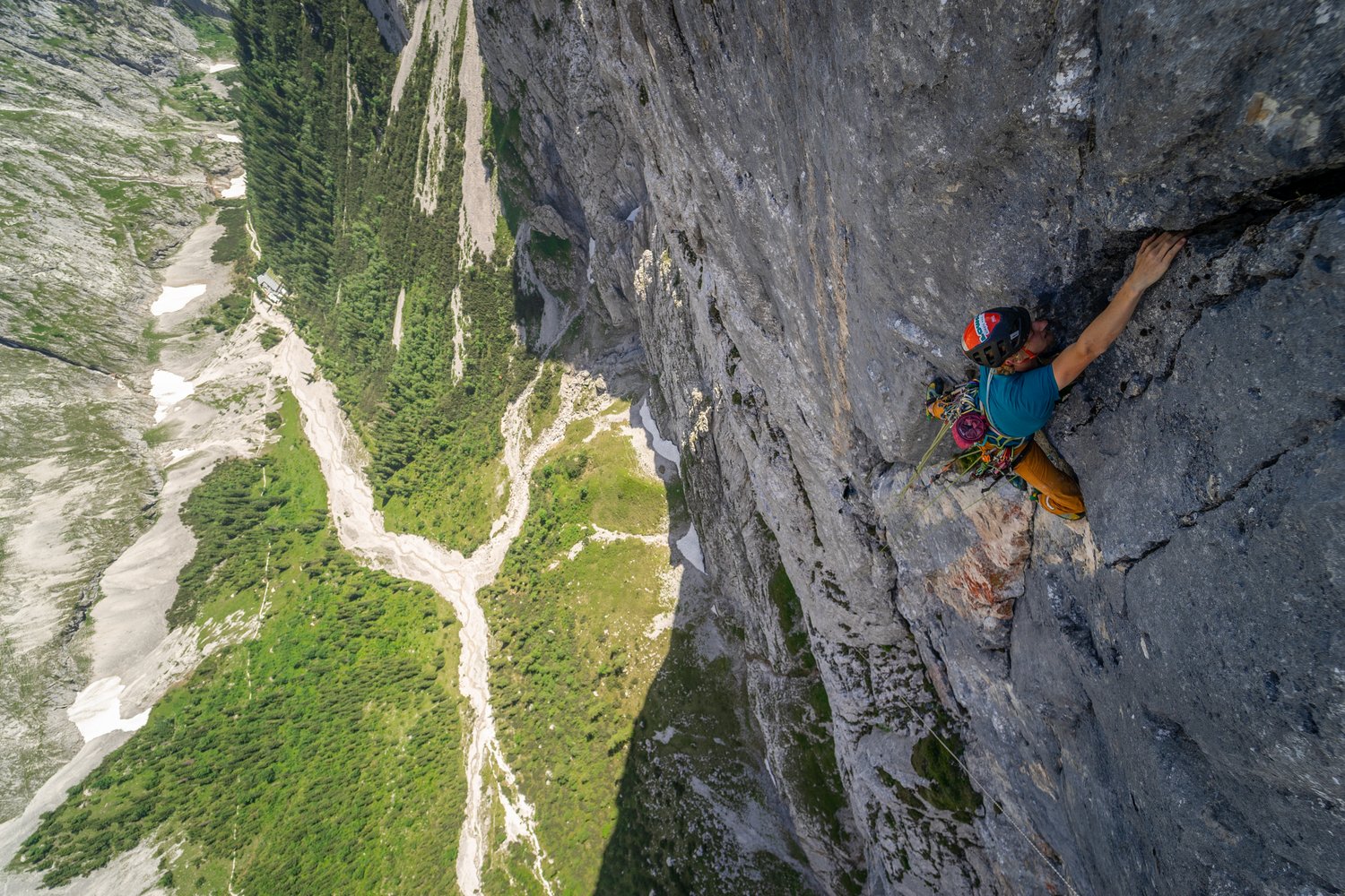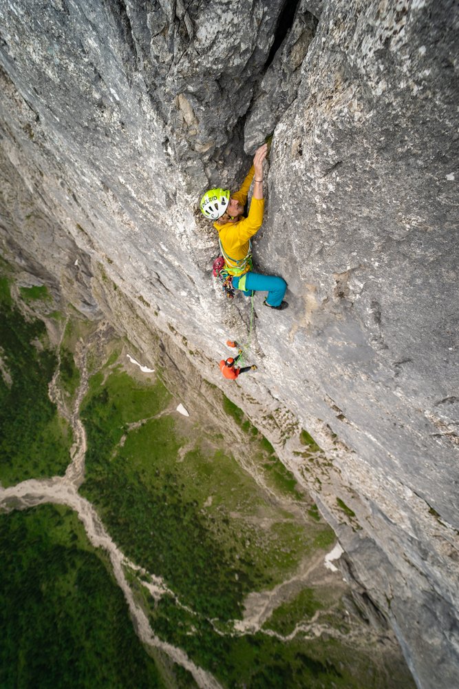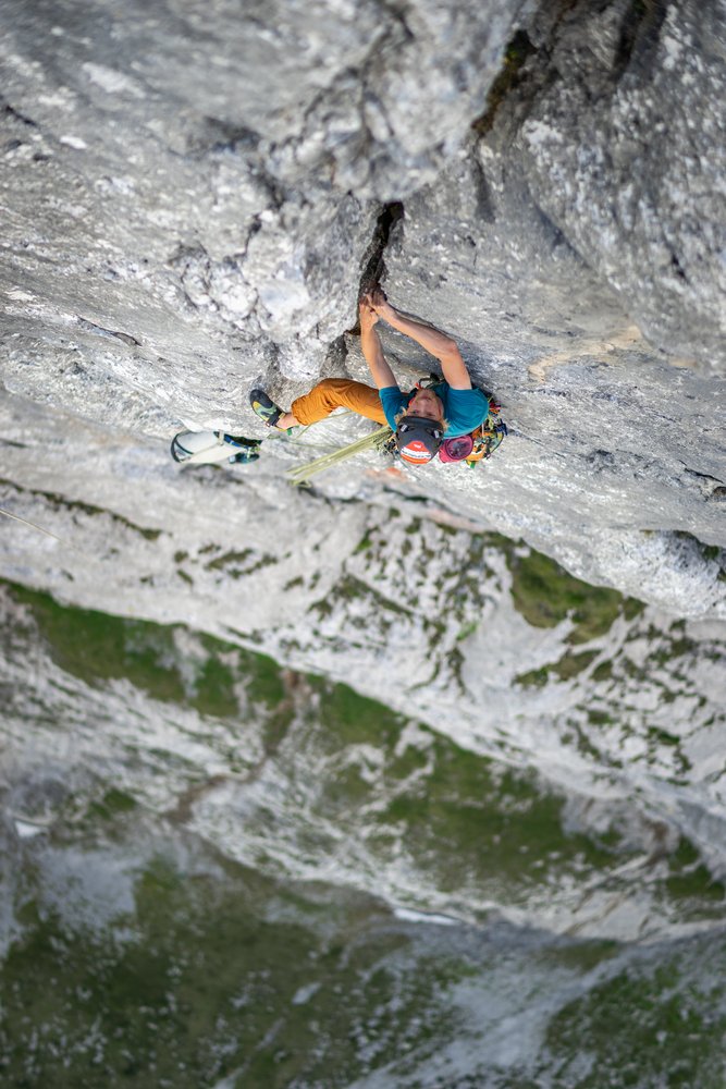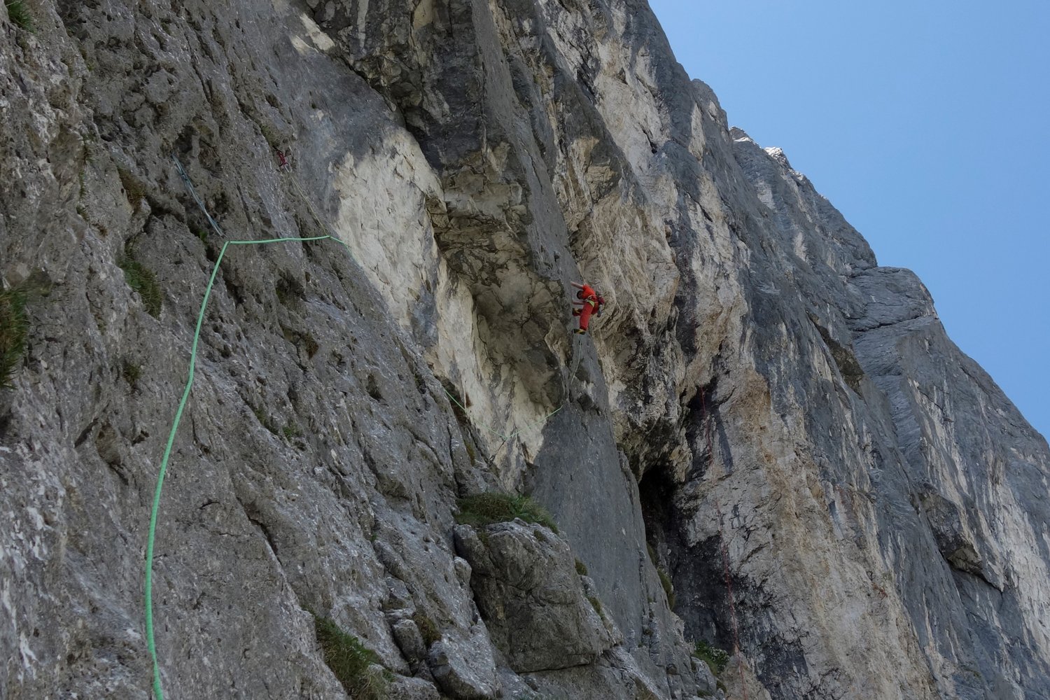 Martin Feistl an 6 Tagen 2015 und 2019 solo von unten unter Verwendung von 300 m Fixseilen. Rostige Zeugen früherer Versuche rechts der Route verlieren sich nach der 4. Seillänge.