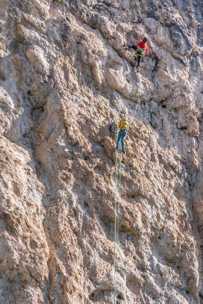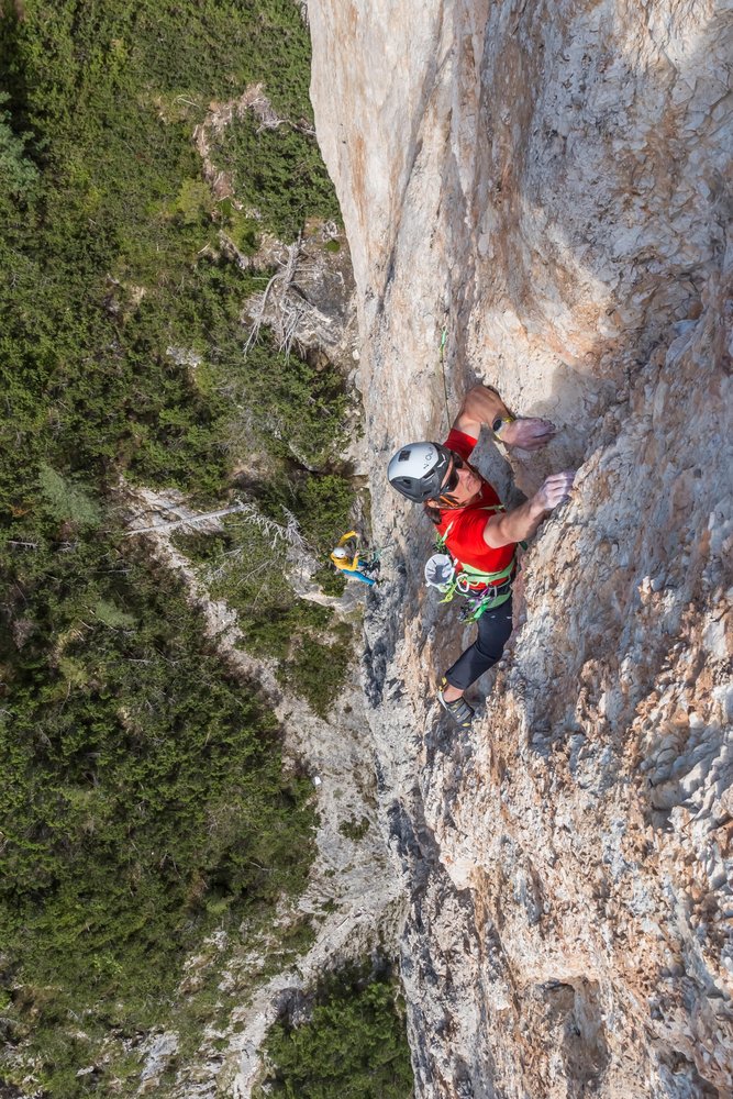 Die Absicherung ist überwiegend mobil möglich, fünf Zwischenhaken und fünf Standhaken wurden gesetzt und belassen. Besonders die letzten 20 Meter sind aufgrund brüchigen Gesteines mit Vorsicht zu genießen und schwieriger zu sichern. Die letzten beiden Seillängen können problemlos zusammen geklettert werden.