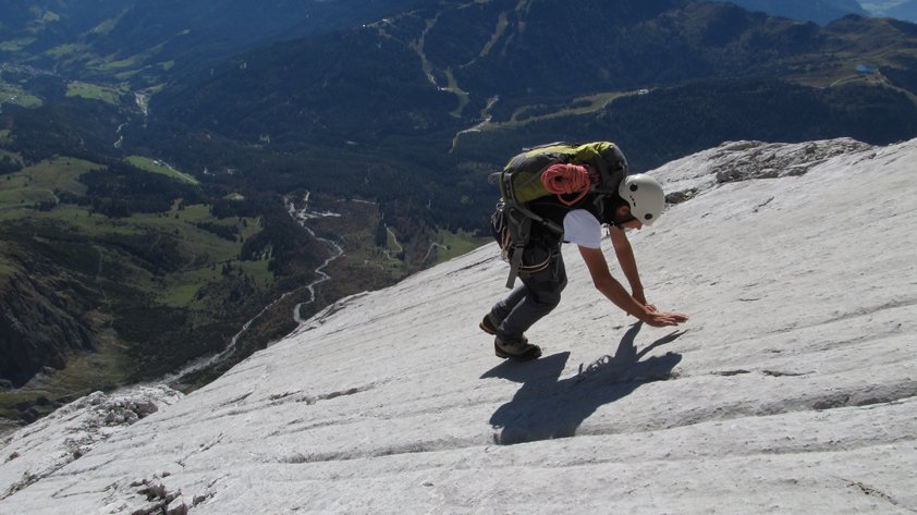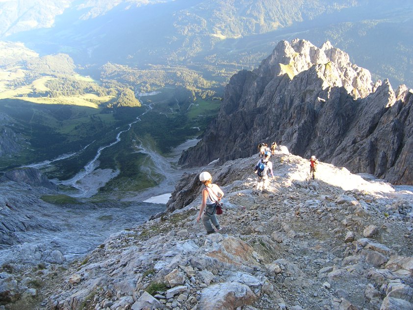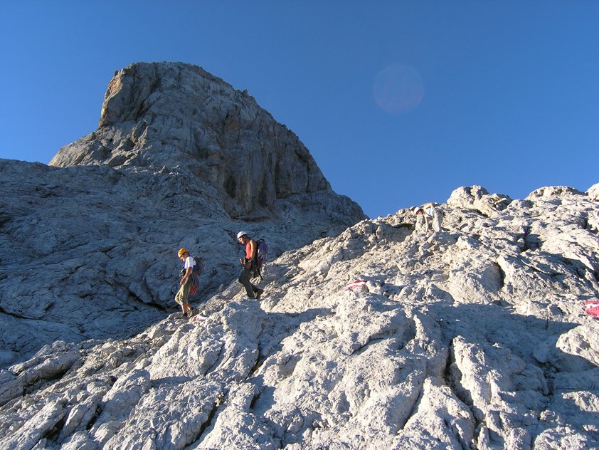 Lange, alpine Klettertour bei der man sinnvoller Weise die ganz leichten Passagen seilfrei klettert. Nur bei stabilem Hochdruckwetter in die Südwand einsteigen - heiße Sommertage sind aber auch nicht ideal (Südwand....).