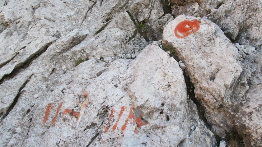 Siehe Topo. Die Tour ist mit roten Punkten und Pfeilen markiert - diese Farbmarken sieht man aber nicht immer auf den ersten Blick.