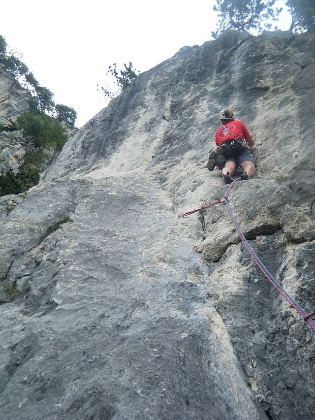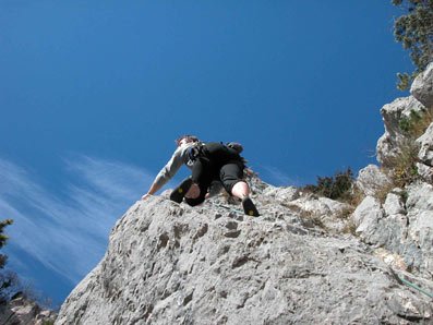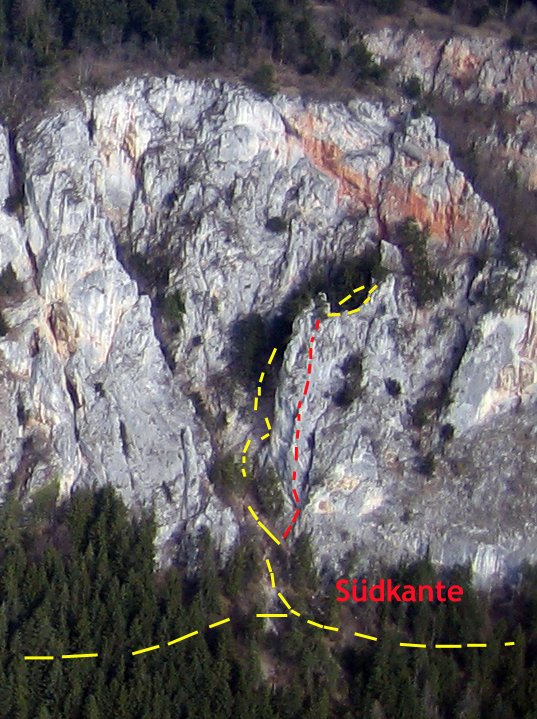Über die Route Abseilen oder oben auf dem Grat zum Fuchslochsteig queren und über diesen unschwierig absteigen.
