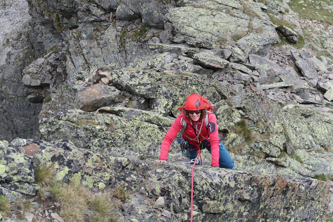 Für einen Grat im Hochgebirge eigentlich recht gut gesichert - im unteren dritten Grat sollte man aber solide (keine Haken) unterwegs sein. Bei Bedarf kann man aber mit Keilen und kleinen bis mittleren Friends die Absicherung verbessern.