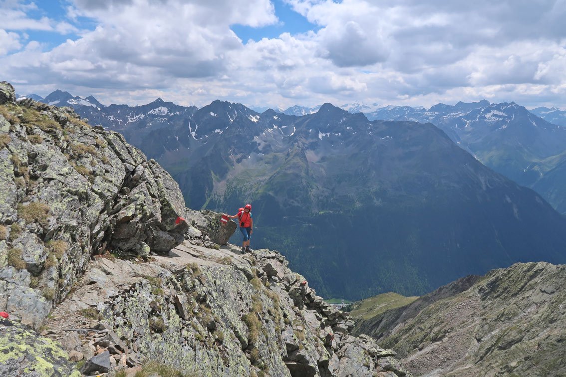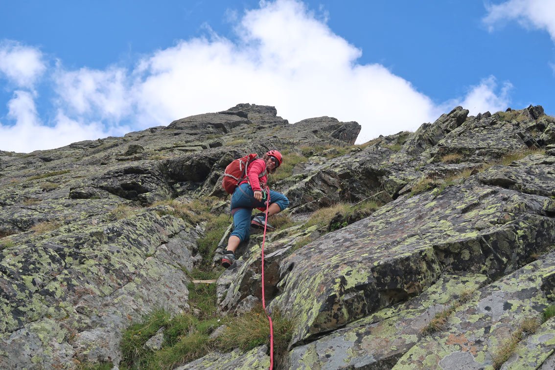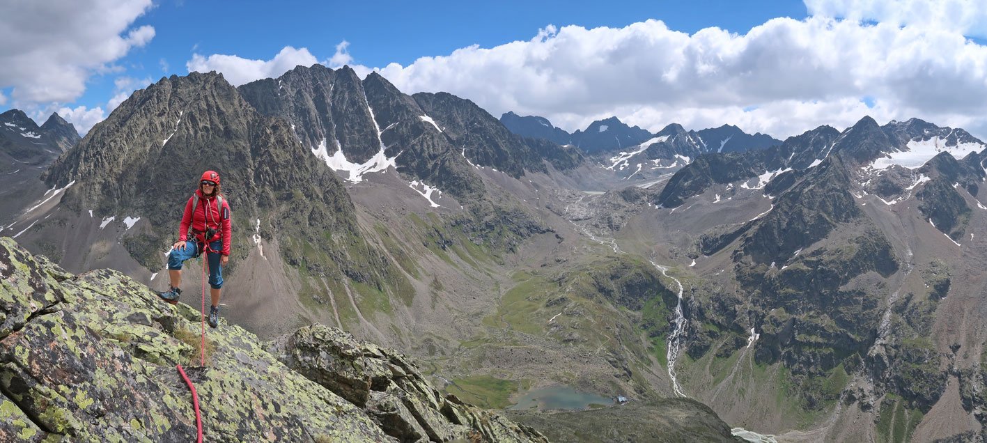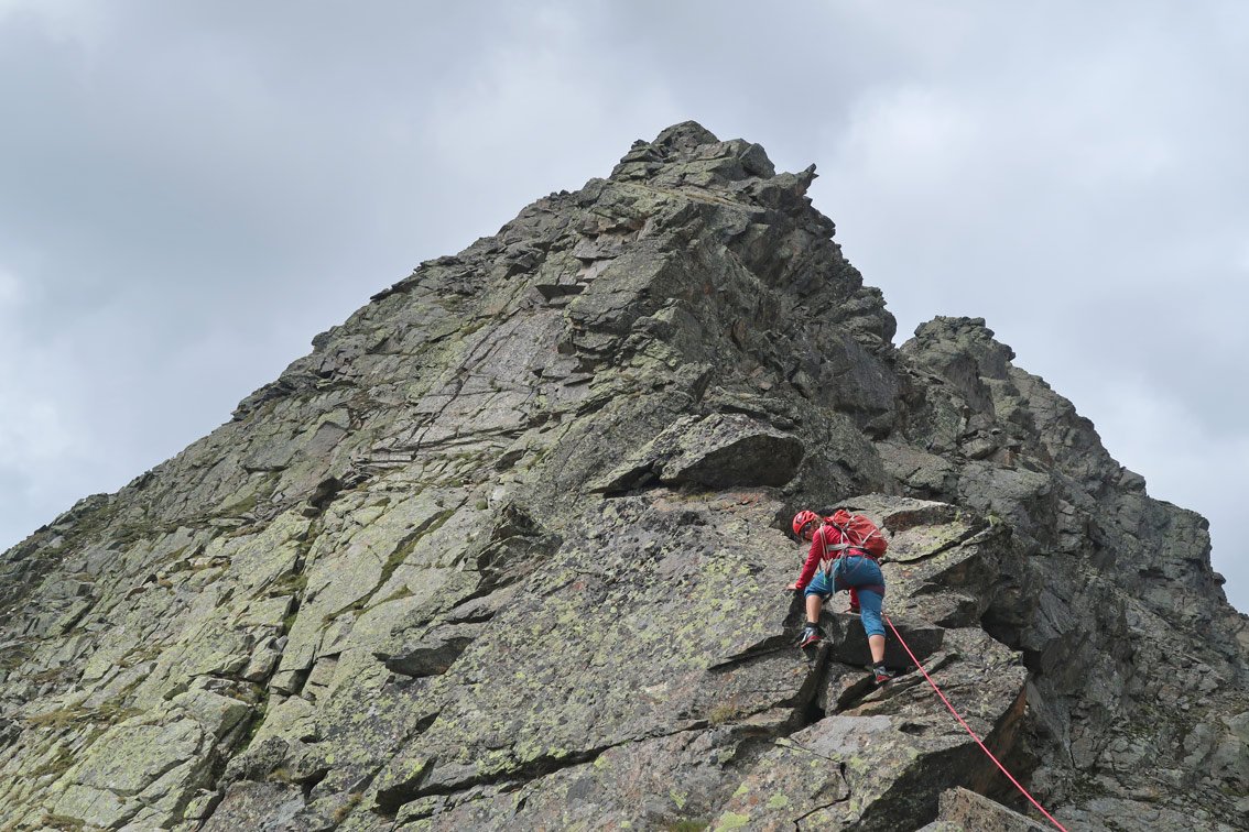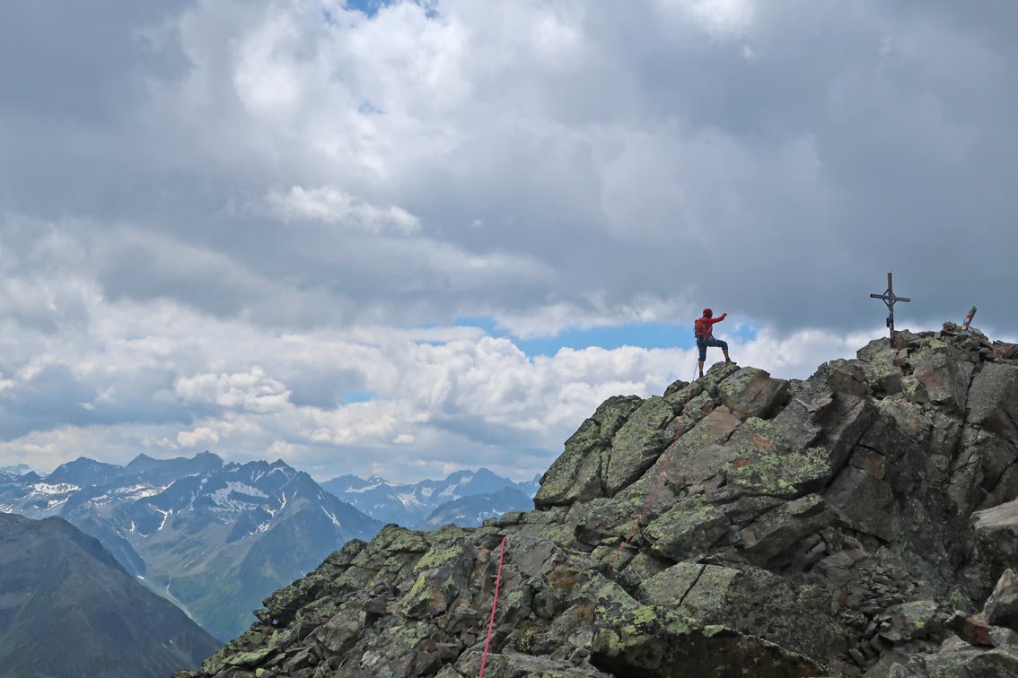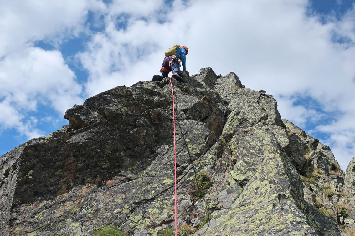 Tolle, nicht all zu schwere Gratkletterei auf den Gänsekragen. Der Ostgrat ist an den Ständen und schweren Passagen mit Bohrhaken gesichert, so macht das Klettern Spaß und man kann auch der schönen Szenerie der Ötztaler- und Stubaier Alpen Beachtung schenken. Man steigt immer im Bereich des Grates höher, Platten, Blöcke und flache Gratpassagen wechseln einander ab und am Ende steht man auf dem 2914 m hohen Gänsekragen. Perfekte Tour um ins alpine Klettern einzusteigen, die schöne Landschaft und die nette Hütte runden den Klettertag formschön ab.