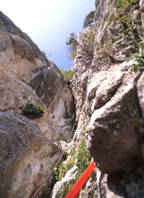 Sehr netter 3er Klassiker mit einer 4- Stelle beim Einstieg (Foto), der seltener begangen wird, dadurch besteht teilweise große Steinschlaggefahr. Der Gaiserkamin befindet sich gleich bei der ersten Seillänge und stellt die Schlüsselstelle der Tour dar, ist aber durch 5 teilweise alte NH gut abgesichert (Foto). Bei der zweiten Seillänge sollte man unbedingt nach dem ersten Klebebohrhaken (Einstieg Traummosaik (5)) nach links auf den Grat ausweichen, da sonst extreme Steinschlaggefahr für die Nachkommenden besteht. Die roten Punkte am Grat sind sehr schlecht erkennbar. Danach wird wieder über die Rinne leicht absteigend gequert und über eine 2er Stelle erreicht man den Höhepunkt des Steiges, die Gaiserplatte (Foto). Auf dieser gibt es neue Klebebohrhaken, man kann aber auch beim rechten Riss die Haken der abzweigenden Steige verwenden. Ein ganz feiner Kamin mit dem Steigbuch folgt, der aber auch links umgangen werden kann (Foto). Nach dem Gehgelände unter dem Bizepswandl und einigen leichten Stellen folgt man noch den wunderbaren Blöcken zum Ausstieg.