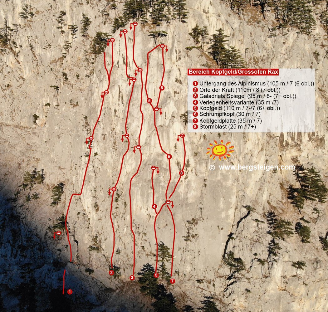 Abseilen über die Route (siehe Topo!). Dann Schnellabstieg vom Großofen über die Geröllhalde unter der Himmelsleiter, welche direkt zur Schwarza führt. Einfach toll und schnell (10 min.)