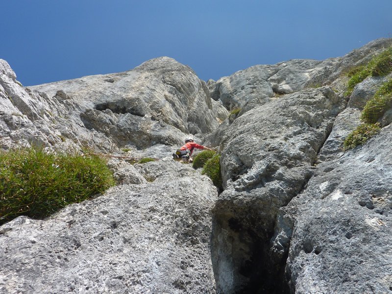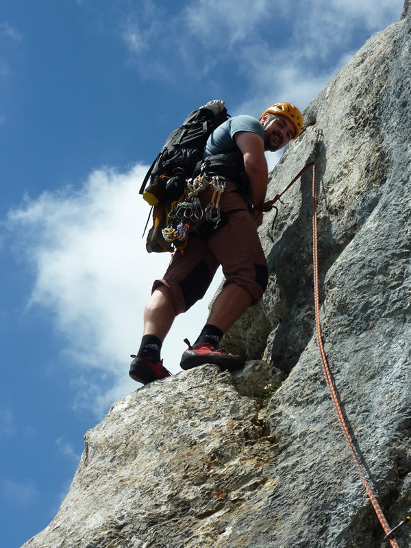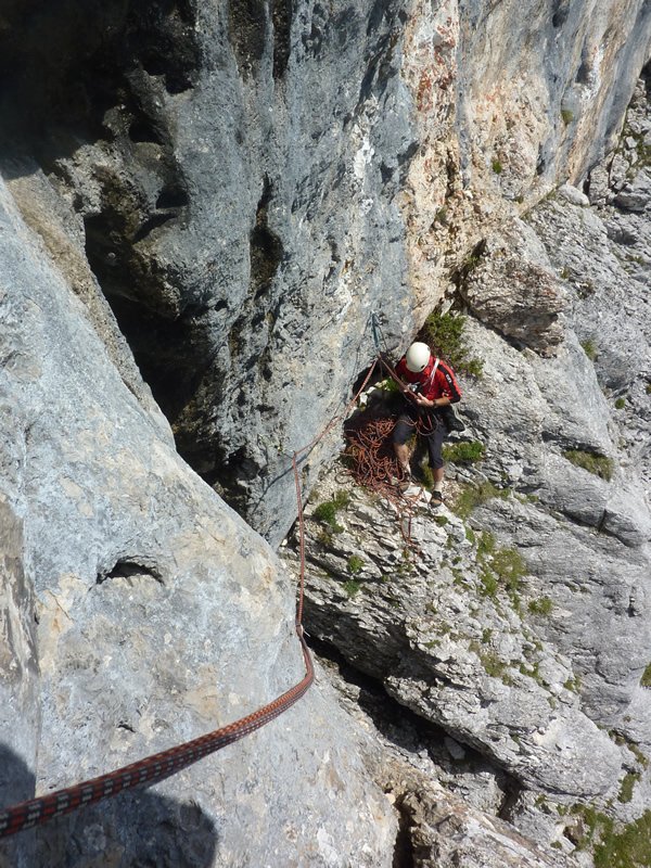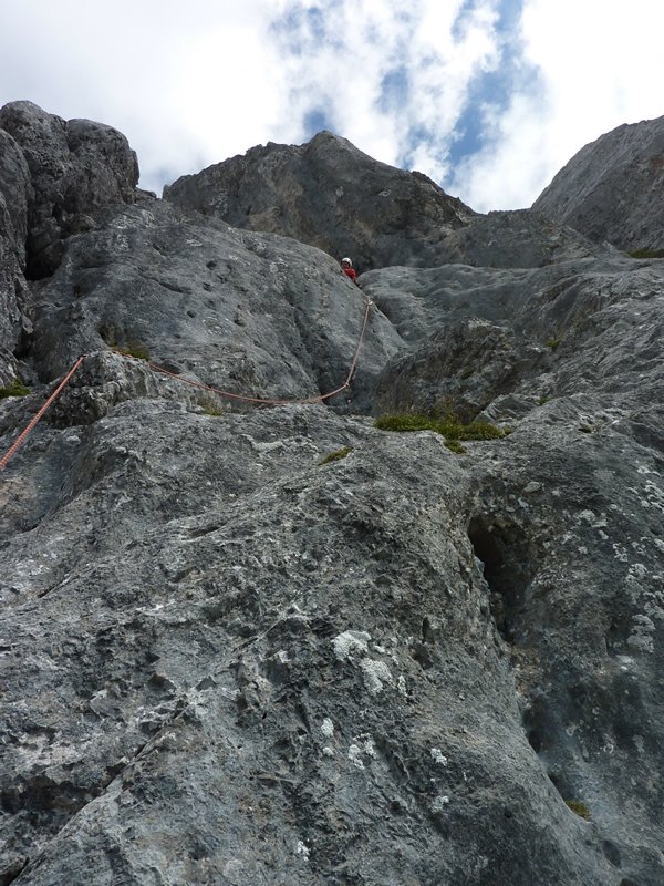 Klassische Gesäusekletterei an meist kompakten Fels. Der Mittelbereich kann nach Regen etwas länger feucht bleiben ist aber supergriffig.