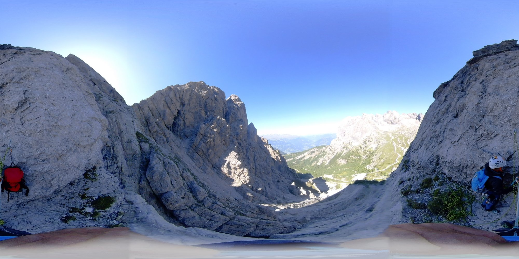 Vom Gipfel auf der Südseite dem Klettersteig hinunter zum Kerschbaumertörl folgen und von dort zum Zufahrtsweg der Karlsbader Hütte (MTB-Depot beim großen Felsblock) absteigen. Wer von der Hütte kommt quert unterhalb des Kerschbaumertörls rechts auf dem Weg zurück zur Lienzer Dolomiten-Hütte.
