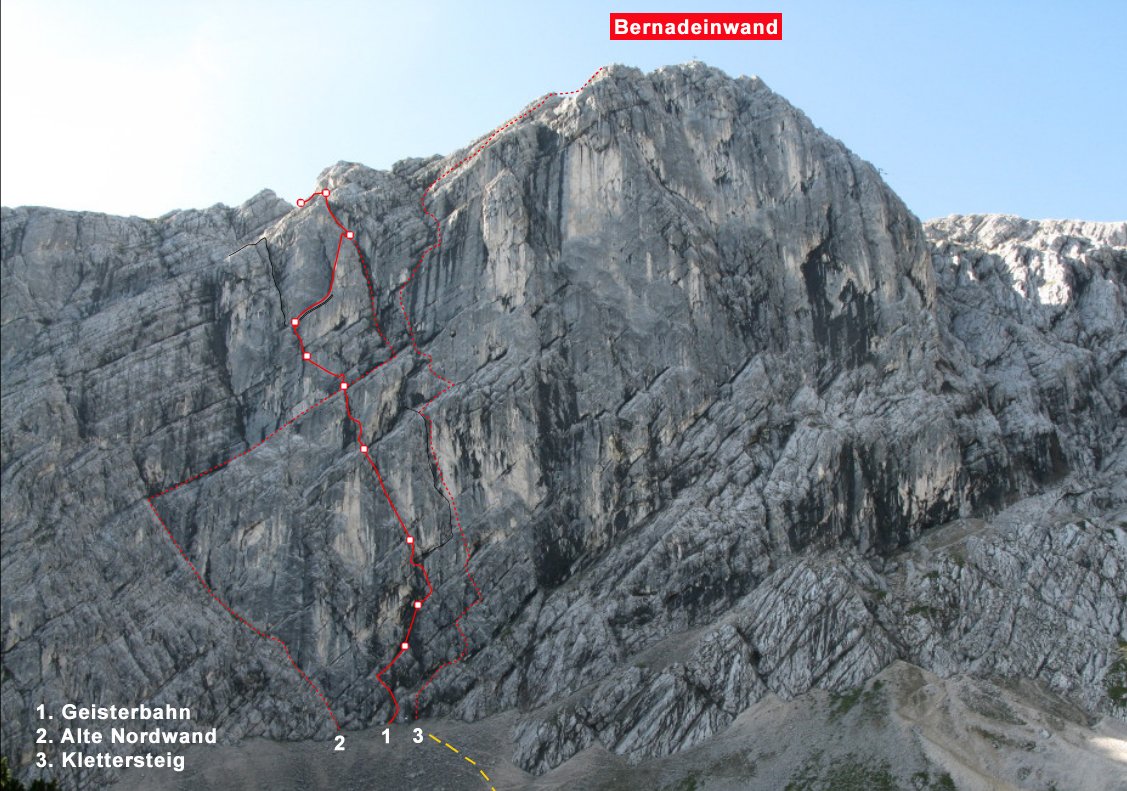 Siehe Topo: Begonnen wird an den ersten beiden Seillängen der vom Mauerläufersteig zerstörten Route "Hochamlrock". Am Beginn der dritten Seillänge nach links abbiegen, um die oben erwähnte Rampe zu erreichen. Ganz oben wird die Rampe wieder zunehmend brüchig. Man verlässt sie daher nach rechts um über Band und eine eine steile Verschneidung in Richtung "alte Nordwand" auszusteigen. Über die letzten beiden Seillängen dieser Route schließlich zum Grat. Vom Ausstieg in 10 Minuten zum Gipfel des Bernadeinkopfes.