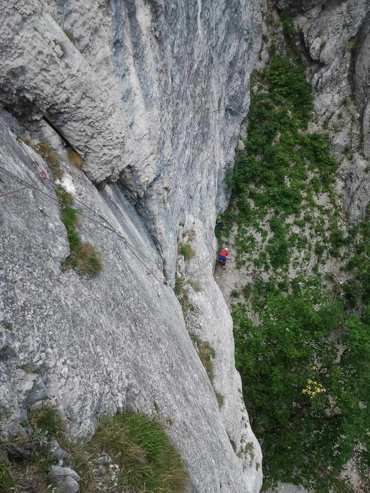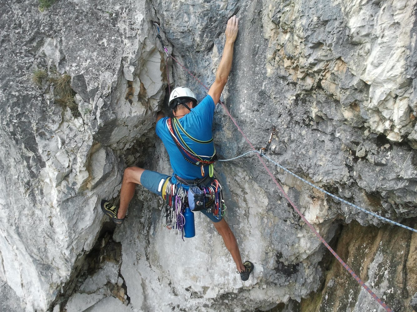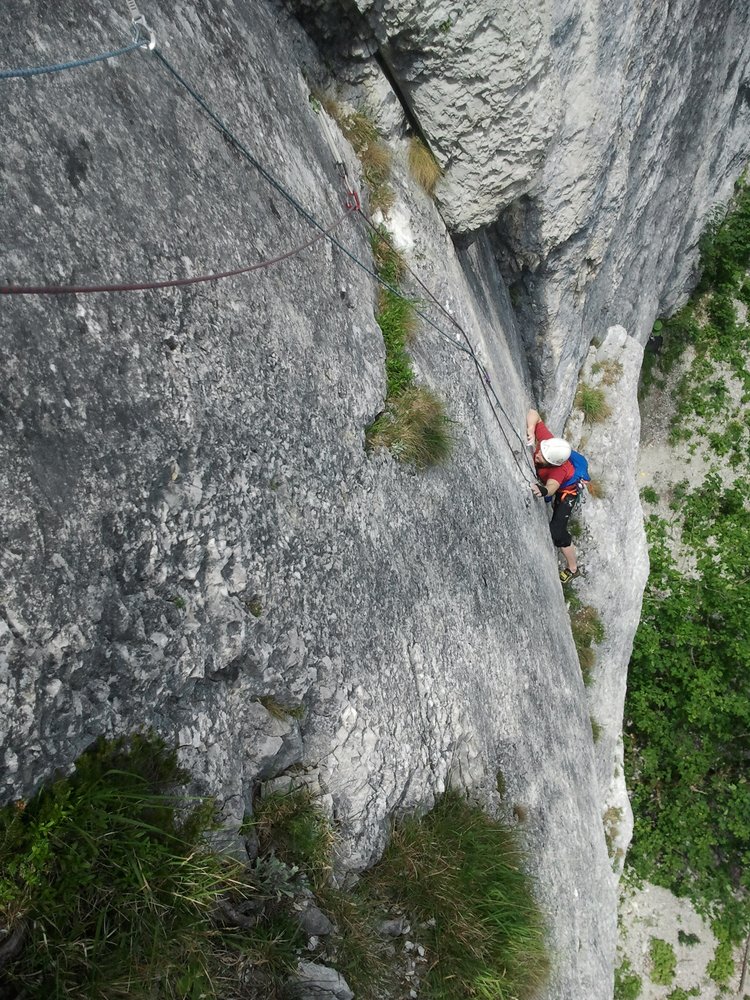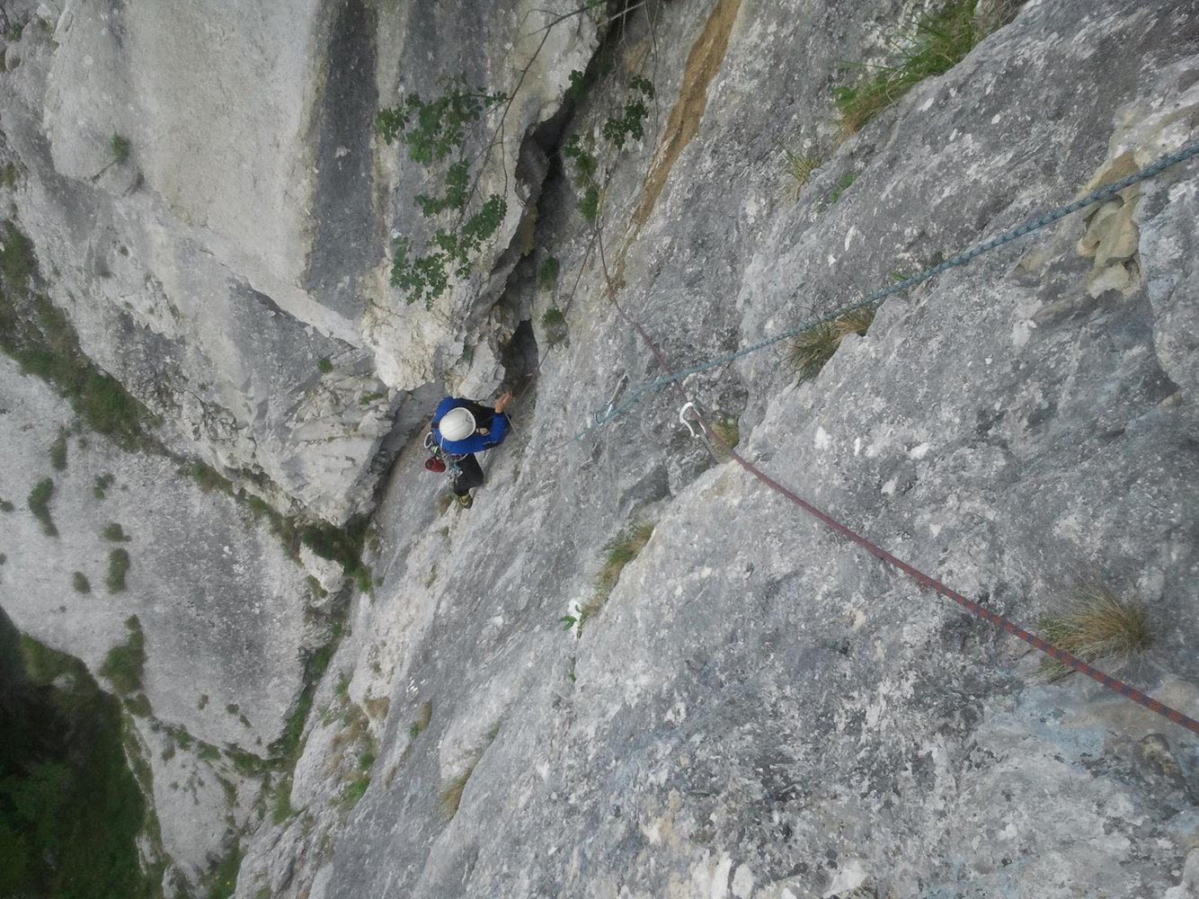 Die Tour ist mit Ausnahme des heiklen Einstiegs (erster Haken etwas weit oben) an den schwierigen Stellen gut A0 oder A1 machbar. An der Crux (4.SL, UIAA 7) besonders dicht gesichert.