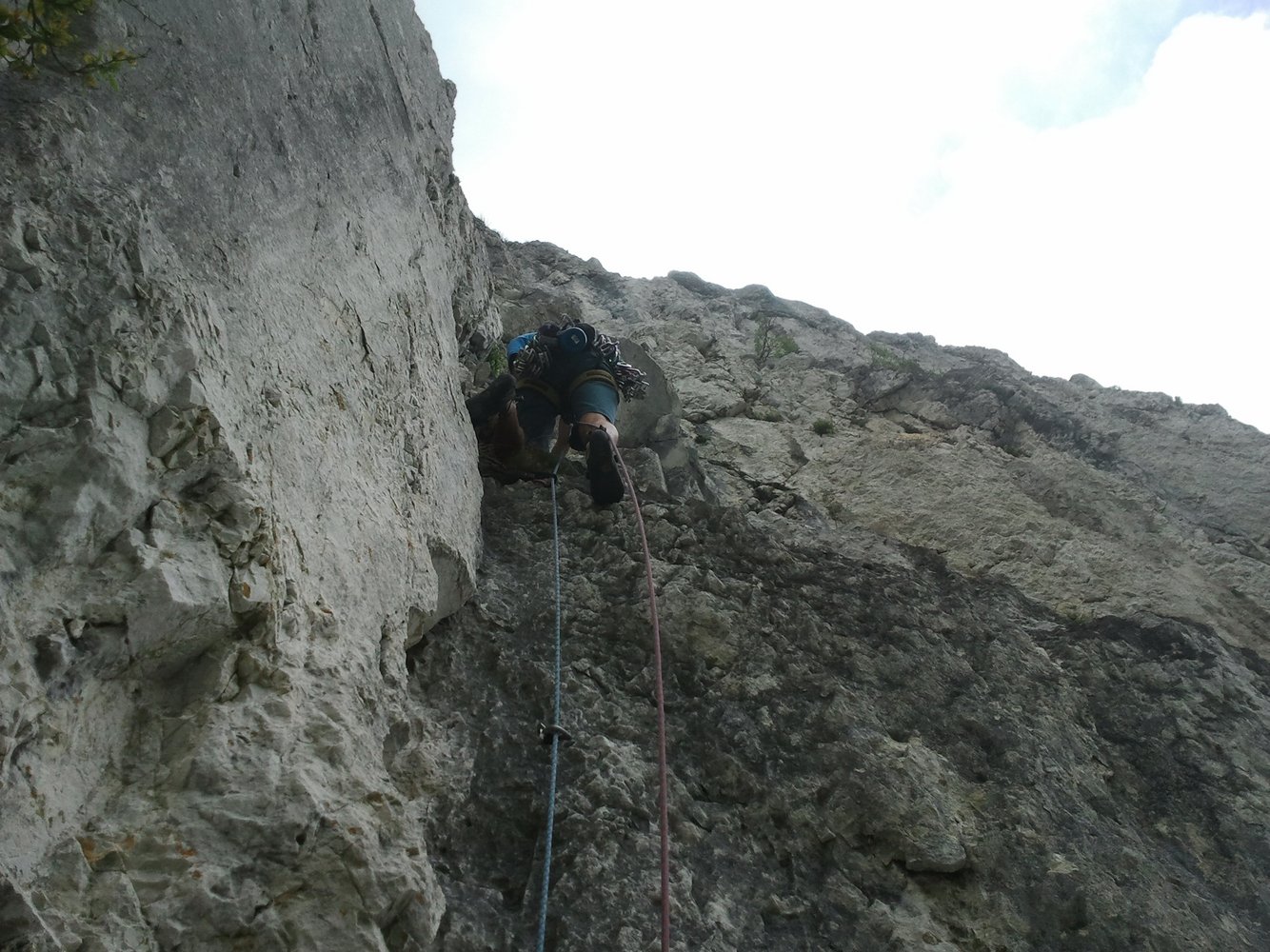 Üppige Normalhakenabsicherung, meist ok. Nur 2 Bohrhaken sowie einige Sanduhren und 2 Holzkeile (!) in den Seillängen vorgefunden.