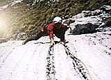Über die Route Glasperlenspiel 5 mal mit Doppelseil bis zum Schneerest in die Rinne abseilen und auf der linken Seite der Rinne absteigen.